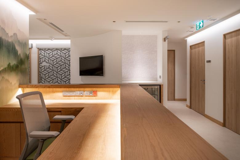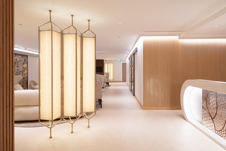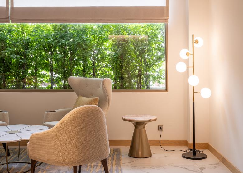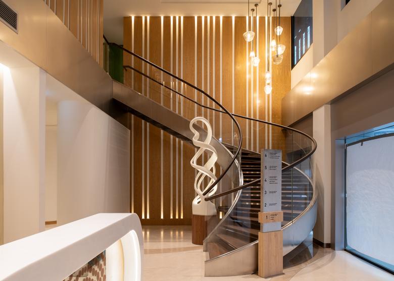 Weiche, runde Formen, die die Patienten durch den Raum führen, werden durch geschwungene Kurven und organische Linien ergänzt. Diese finden sich in der Wendeltreppe am Haupteingang und in den geschwungenen Kanten der Möbel wieder. Sie regen zur Bewegung an und reduzieren gleichzeitig die visuelle Belastung. Die Wartebereiche und Lounges sind so angeordnet, dass sie ein Höchstmaß an Privatsphäre bieten. Gleichzeitig vermitteln sie ein Gefühl von Offenheit und Verbundenheit.