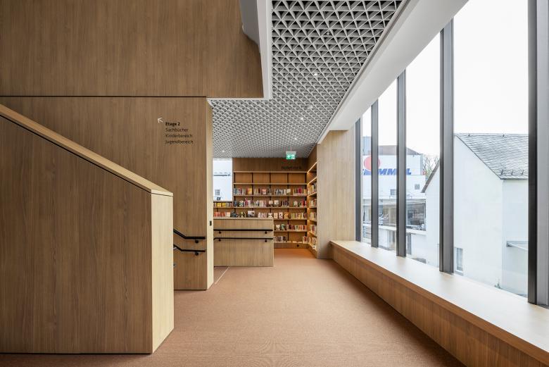 Bei der gebäudetechnischen Ausstattung wurde besonderer Wert auf ästhetisch zurückhaltende Elemente gelegt. Ein Großteil der Technik ist unter einer offenen Dreiecksrasterdecke verborgen: Sie erfüllt akustische Funktionen und ermöglichte die verdeckte Installation von Lüftungsanlagen, Leitungen und Brandmeldeanlagen. Für Schalter und Steckdosen wurde das schlichte Programm LS 990 von JUNG in Schwarz verwendet. Die klaren Linien und das reduzierte Design fügen sich zurückhaltend in das Gestaltungskonzept ein. Das Lichtkonzept kombiniert gekonnt Tages- und Kunstlicht. Eine intelligente Lichtsteuerung ermöglicht sowohl eine zonierte Beleuchtung für Arbeits- und Leseplätze als auch atmosphärische Akzente im Veranstaltungsbereich.
