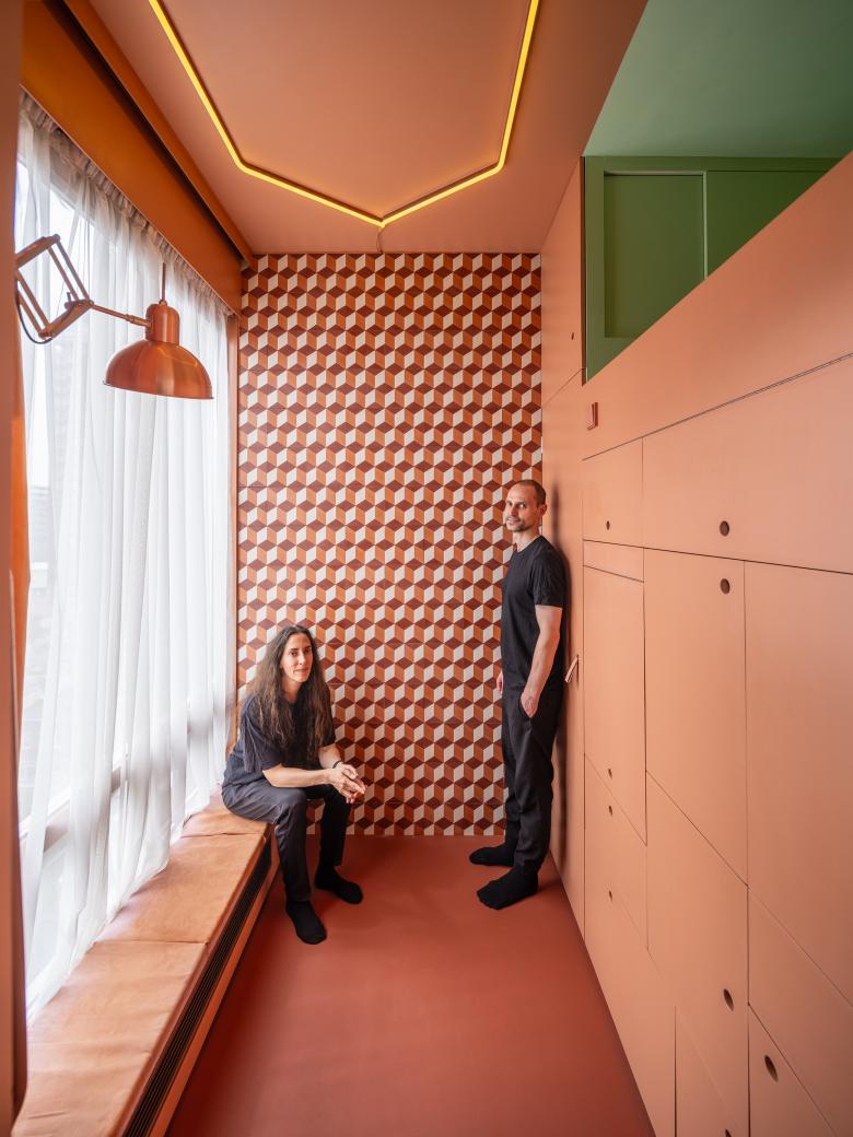 Die Architektur basiert auf einem präzisen Raumkonzept: Vier autonome Bereiche mit jeweils unterschiedlichen Materialien und Raumhöhen maximieren die Nutzung der begrenzten Fläche. Die Dimensionierung ergab sich aus den individuellen Bedürfnissen und Maßen der Nutzer - die Architekten wurden sozusagen zu ‚Modulor‘ ihres eigenen Raumes. Der Wohnbereich mit Küche ist mit 3 m Höhe großzügig, der Schlafbereich mit 1,14 m Höhe bewusst kompakt gehalten. Die Dusche mit WC und das Spa, der einzige geschlossene Bereich, sind funktional optimiert, so dass jeder Quadratzentimeter eine bestimmte Aufgabe erfüllt. Ein 6 m² großes Fenster öffnet den Raum zur Stadt und verstärkt trotz der kleinen Grundfläche das Gefühl von Weite. Die Materialwahl folgt einem pragmatischen Ansatz. Statt der ursprünglich geplanten hochwertigen Oberflächen wie grüner Marmor, weißes Mosaik oder blaue Zementfliesen wurden erschwingliche Alternativen aus Outlet-Stores gewählt - schwarze Marmorplatten aus den 1980er Jahren für das Spa, blaues Mosaik für die Dusche und warme Korallentöne für den Wohnbereich. Aus dieser Materialwahl erfolgte auch die Auswahl der Schalterserie LS 990 Les Couleurs® Le Corbusier in 32111 l’ocre rouge moyen. Das einzige bewusst gewählte Farbelement ist das mintgrüne Schlafzimmer, das mit seiner sanften Beleuchtung einen gemütlichen Rückzugsort schafft.
