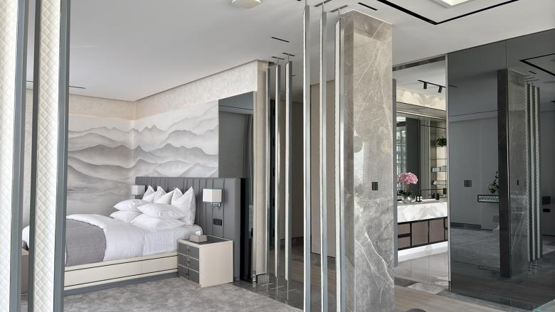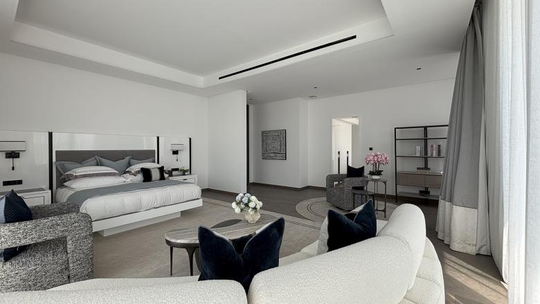 Der Neubau erstreckt sich über drei Ebenen und bietet mit rund 2.600 Quadratmetern Wohnfläche ein auf Großzügigkeit und Ruhe ausgelegtes weitläufiges Raumangebot. Sieben Schlafzimmer, mehrere Wohn- und Aufenthaltsbereiche sowie ein repräsentatives Atrium mit Glasdach und skulpturaler Lichtinstallation strukturieren das Gebäude. Großformatige Fensterflächen schaffen fließende Übergänge zwischen Innen- und Außenbereich und öffnen die Räume zum Garten mit Pool, Lounge und Außenküche. Die Fassade ist geprägt von hellen Natursteinoberflächen, glatten Putzfeldern und klar gegliederten, horizontalen Linien. Bodentiefe Verglasungen und fein gesetzte Lichtdetails betonen die Geometrie auch bei Nacht. Im Inneren prägen gespachtelte Wände, polierter Marmor, dunkle Holzoberflächen und sorgfältig abgestimmte Textilien das Bild. Die Innenarchitektur setzt auf Maßanfertigung und handwerkliche Präzision: Einbauten, Möblierung und Lichtplanung folgen einem übergeordneten gestalterischen Konzept, das auf Reduktion, Eleganz und hohe Funktionalität abzielt. Besonderes Augenmerk gilt der Raumwirkung mit durchdachten Blickachsen, zurückhaltender Farbgebung und gezielter Lichtführung. Kunst und Sammlerstücke sind bewusst inszeniert, etwa in beleuchteten Vitrinen oder über einzelnen zentralen Möbelstücken wie dem Flügel im Eingangsbereich.