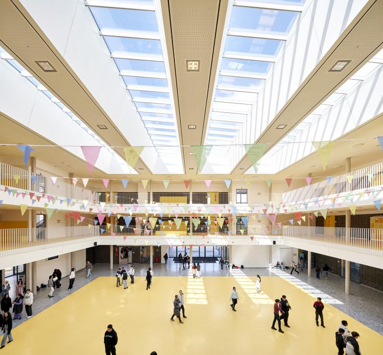 Es wurden großen Wert auf die barrierefreie Erschließung aller Räume gelegt, auf ein gesundes Klima in den Klassenräumen und ausreichend natürlichen Lichteinfall. Freuen können sich die Schülerinnen und Schüler auch über zusätzliche Rückzugsorte und Arbeitsplätze neben den üblichen Klassenräumen: Die Galerie rund um das Atrium bietet multifunktional nutzbare Flächen.