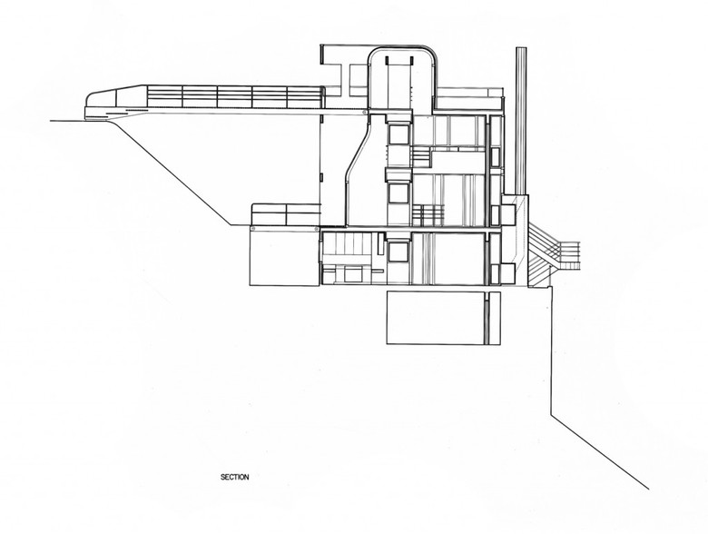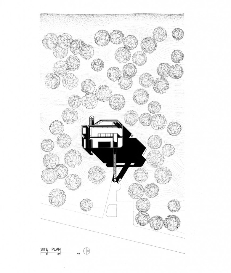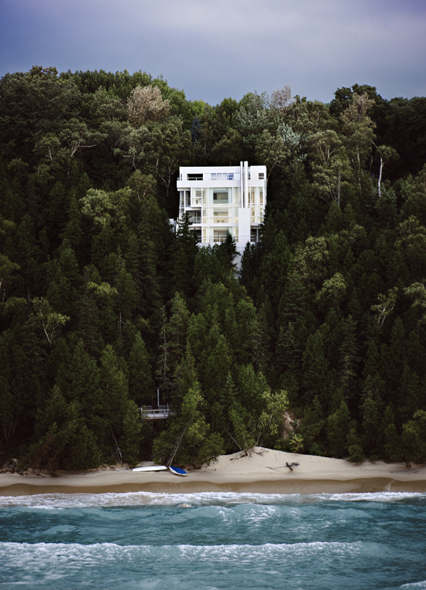 The Douglas House is dramatically situated on an isolated site that slopes down to Lake Michigan. So steep is the fall of the land from the road down to the water that the house appears to have been notched into the site, a machined object perched in a natural world. The entry to the house extends beyond the building envelope. Here, as the sharp downhill grade of the land requires the house to be entered at roof level, it takes the form of a flying bridge that seems to shear off the top of the frontal plane.