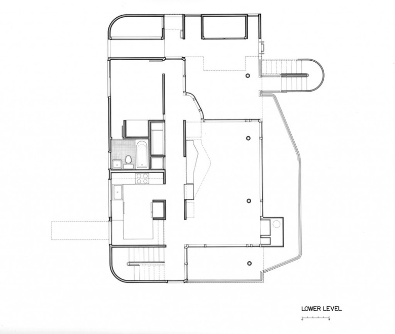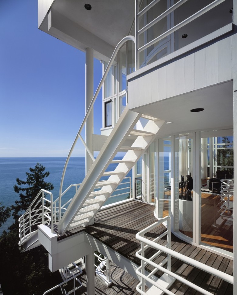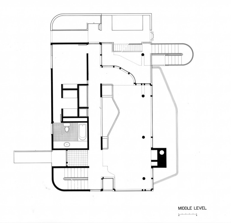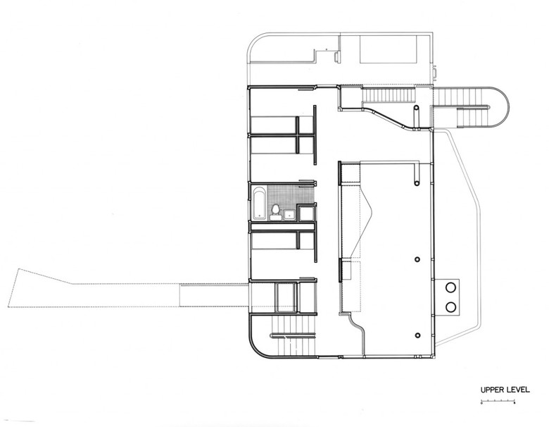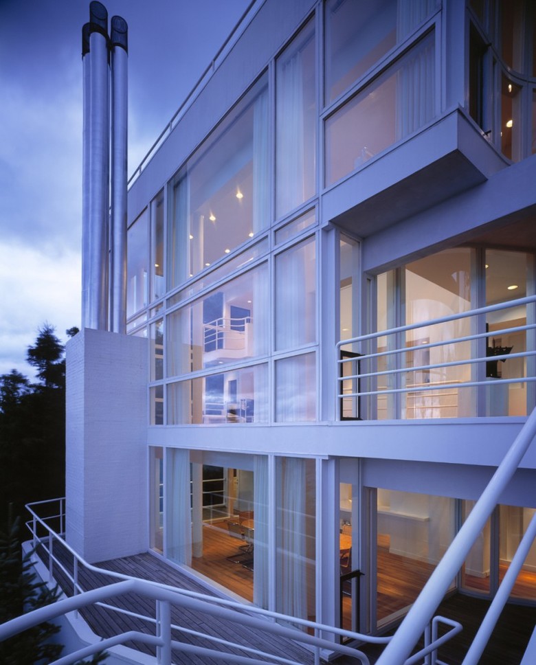 Once inside the entry vestibule, the views opens to the west, down to both the living and dining levels, and out to a large roof deck overlooking Lake Michigan. As in the Smith and Hoffman houses, the living-room fireplace is located directly opposite the entry, but in this case it is two stories below. At roof level, its stainless-steel smokestacks act as a foil to the entry and frame the view. Horizontal circulation moves along four open corridors, stacked one above the other behind a screen wall. Internal and external staircases provide vertical passage at the corners.