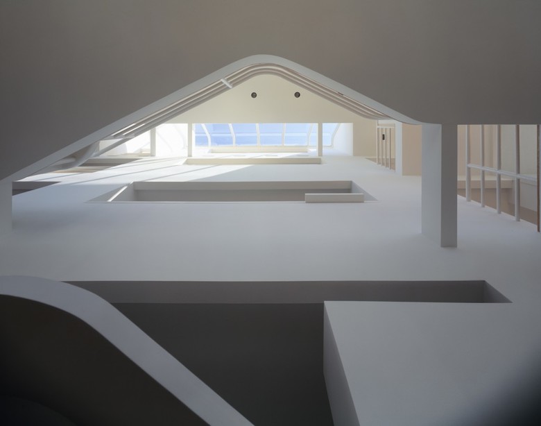 The east side, facing the road, is the private zone, protected by a taut white membrane pierced by square apertures and horizontal strip windows. The roof-level bridge accentuates the unimpeded flow of space between this wall and the hillside, and is experienced as an activated void that further seals the private zone from the road.
