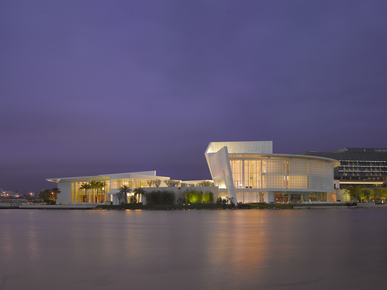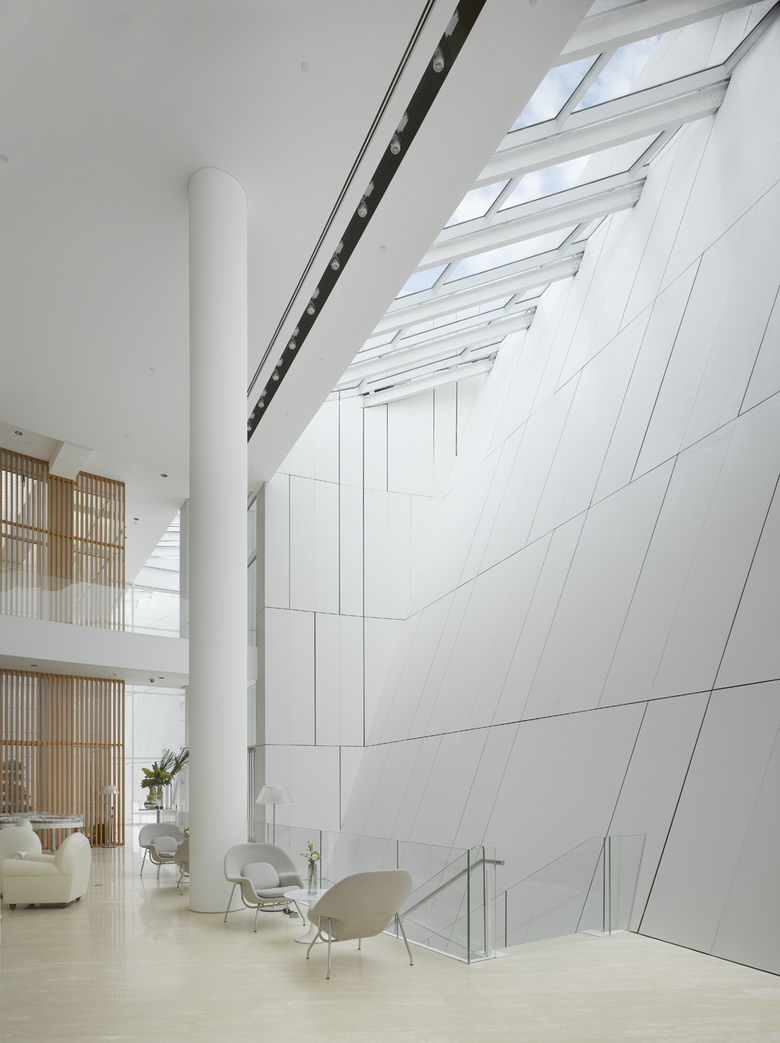 The geometry of the Clubhouse follows a precise focal point from which “layers” of distinct spaces radiate and terminate in a sweeping curve that is seen from the Cultural and Entertainment Center across the water. At the south end of the island, linked to the Clubhouse by an outdoor pathway and garden, is the structure that houses the Indoor Pool and Fitness Center. The simple geometry of the Fitness Center contrasts with the adjacent Clubhouse in scale and form, providing a balance with the extroverted outline of the Clubhouse and stimulating the dialogue between the two structures.
