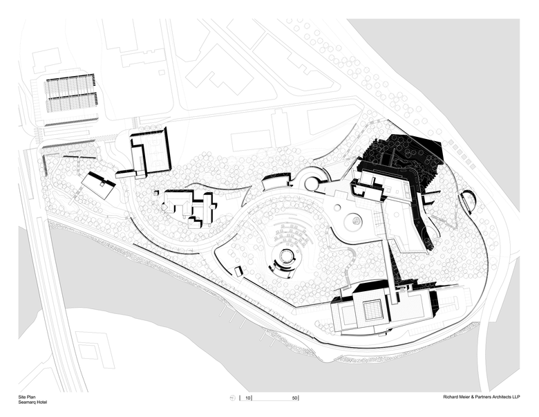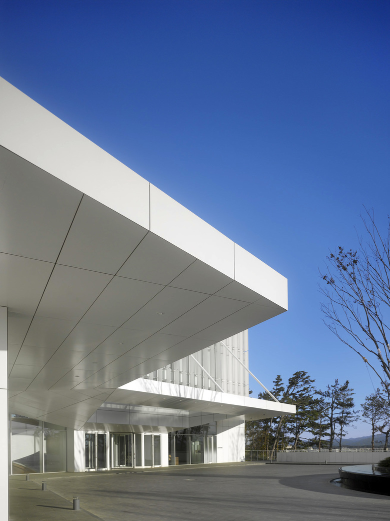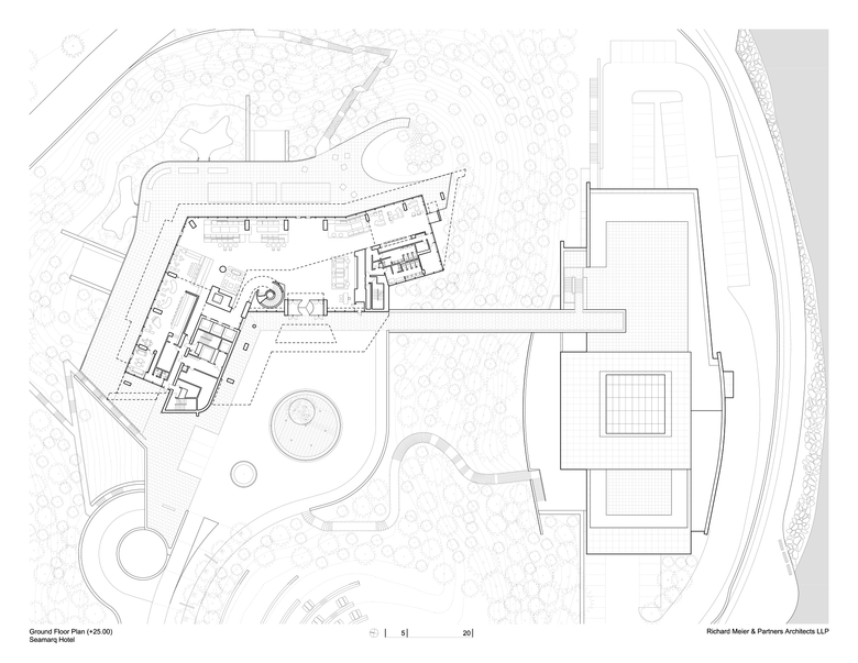 Nestled on a spectacular dense hill with magnificent old pine trees and facing the East Sea of the Korean coast, the new Seamarq hotel at Gyongpodae is a one of a kind boutique hotel composed of two main buildings and supporting facilities scattered throughout the site. The Hotel tower is anchored to the summit plateau and located very close to the ocean as if it was emerging from the ground. In contrast, the Banquet Hall is embedded into the vegetation and integrated into the landscape.