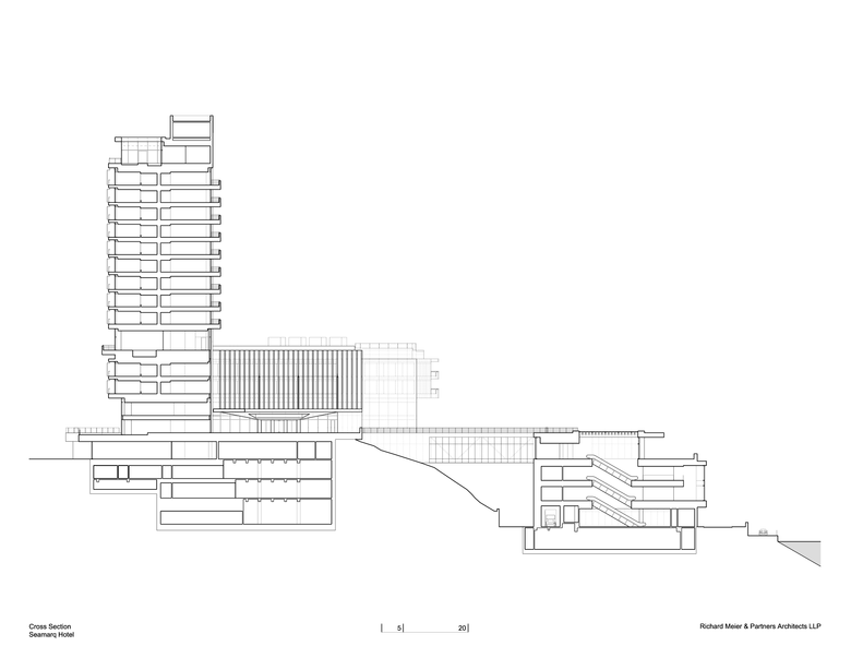 The porte-corchere framed by the Hotel building canopy and entrance to the Banquet Hall opens to a grand two story lobby lounge and bar facing the sea at ground level with a wraparound outdoor deck as an extension of the lobby. The views are unobstructed and maximized with indoor and outdoor spaces that flow seamlessly together. The restaurant is nestled into the existing landscape one level below the lobby and enjoys immediate and close views of the sea and the beachfront. The spa is one more level below, with calm and tranquil spaces open to the dense vegetation and landscape, with its form following the natural shape of the hill. A presidential suite is at the tower’s summit with a generous terrace and courtyard garden with open views in all directions.