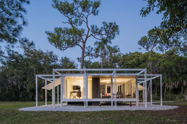 A full-scale replica of the Walker Guest House, originally built in 1952 on Sanibel Island, Florida, is on display in Palm Springs, California, where it will be sold in situ in an online auction coinciding with Palm Springs Modernism Week in mid-February.