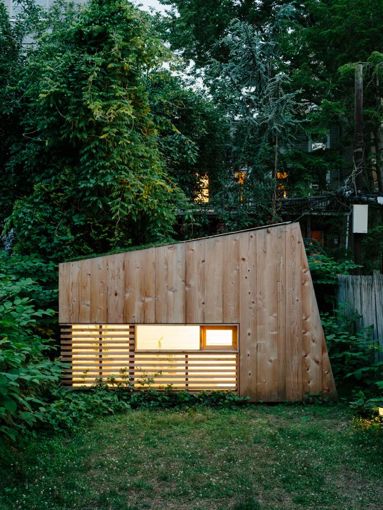 This 55-square-foot (5.1-sm) backyard retreat in Brooklyn is a site of experimention for architect Nicholas Hunt, who covered the walls inside and out with salvaged fencing and salvaged cedar siding, respectively, and put a planted roof and skylight overhead. In his words, "It...