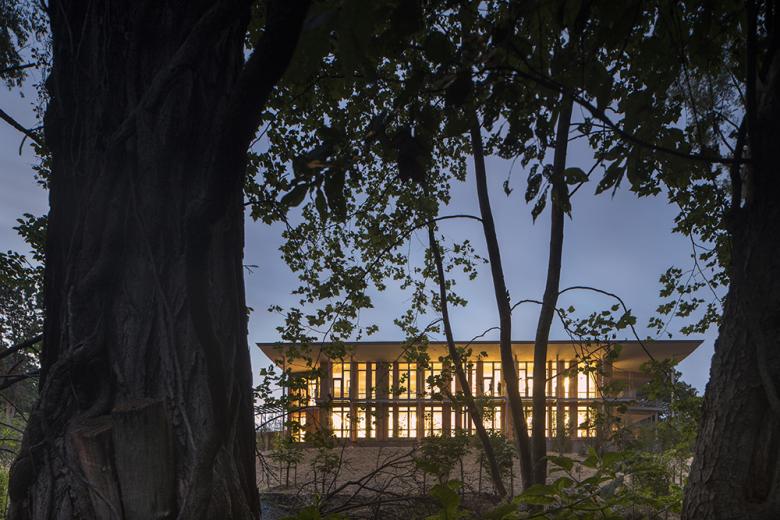 A precedent photo from LEVER Architecture shows a tree in the process of being felled, an angular chunk removed from its trunk. This image resonates with the section of the TreeHouse, which contends with a sharp drop from one side of the site to the other by a bridge and a glazed wrapping...