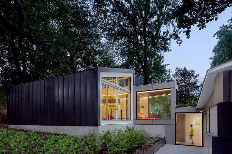 The moniker for this residential addition in a small town north of Washington, DC, says it all. KUBE architecture doubled the footprint of a 1950s modern house but "splits" its gable roof into two sheds to bring in lots of natural light and frame views of the property's mature trees. The...