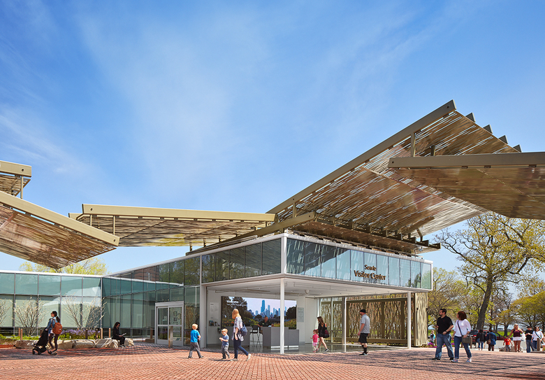The always free Lincoln Park Zoo in Chicago opened its new Searle Visitor Center in November as the latest piece in its Pride of Chicago capital campaign. Topped by angled planes of metal, the building makes for a striking gateway to the zoo from the east. Ross Barney Architects sent us some...