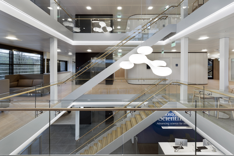 Offene Workspaces mit dem Ziel, mehr Austausch und Effizienz im Unternehmen zu ermöglichen – das haben N architecten und N interieurarchitecten für Boston Scientific umgesetzt. Die Beleuchtung wurde in weiten Teilen mit Nimbus-LED-Leuchten umgesetzt. „Eine Stärke von Nimbus ist, dass das Sortiment durchgängige Lösungen für alle Beleuchtungs-anforderungen beinhaltet. Das Lichtkonzept mit Nimbus-LED-Leuchten hat auch einen entscheidenden Beitrag zur Nachhaltigkeit des Gebäudes geleistet“, so die Planer.