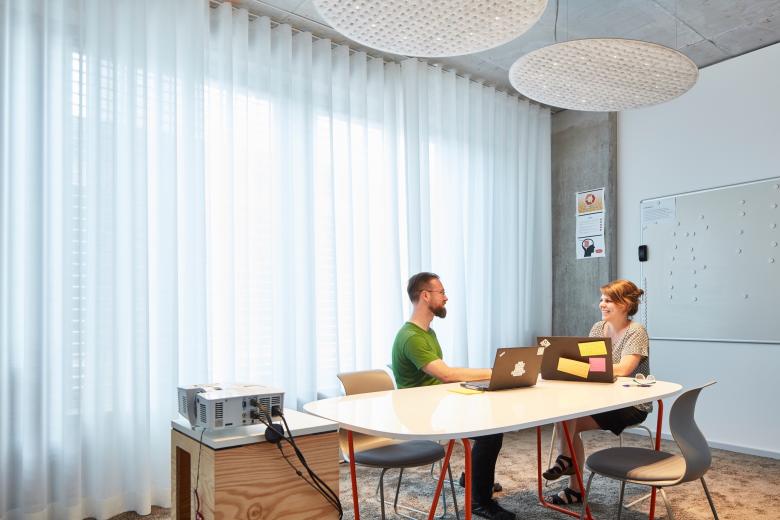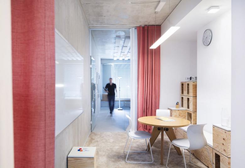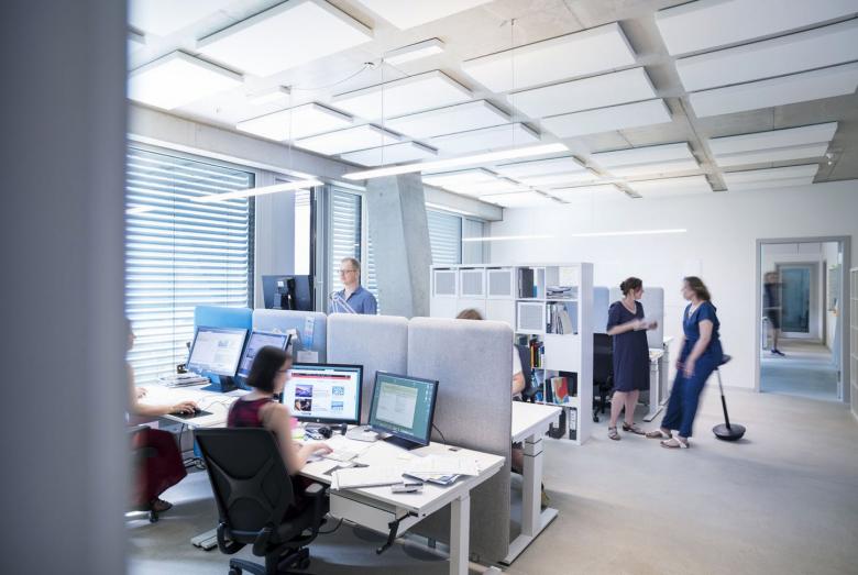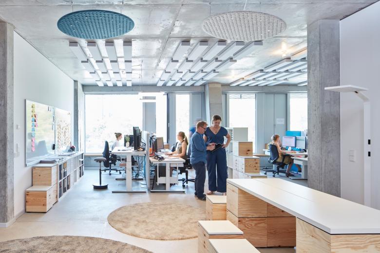 Mitten in Berlin entstand mit dem Frizz23 in der Friedrichstraße ein Ort für Kreativwirtschaft, Bildung und temporäres Wohnen. Auch competitionline, eine der bekanntesten Internetplattformen für Architekten, hat hier neue Räume bezogen. Die Mitarbeiter haben nun zwar etwas weniger Fläche zur Verfügung - dafür aber eine deutliche qualitative Verbesserung der Arbeitsräume. “Der raue industrielle Charme des Objekts begeistert: die hohen Decken, die glatten Beton-, Estrich- und Glasflächen.“ so Tanja Ptacek und Dirk Bonnkirch von competitionline, die den Umzug maßgeblich betreuten. Als „kommunikatives Unternehmen“ machten sie sich auch Gedanken über die akustische Situation in den Räumen und ließen sich früh von Fachleuten beraten. Teil des Akustik-Konzepts sind von den Decken abgependelte Lighting Pads von Nimbus. Als effiziente Schallabsorber liefern sie gleichzeitig brillantes Licht. Mit ihrer filzigen Haptik und ihrer effektvollen Farbigkeit in kühlen Grau- und Blautönen dienen sie als natürlich wirkende Gegenspieler zu den vorwiegend glatten Flächen im Innenraum. Gestalterisch finden sie ihre Fortsetzung in Leuchten von Nimbus, die ästhetisch die gleiche Sprache sprechen und verschiedenste Arbeitsbereiche mit der jeweils passenden Beleuchtungssituation ausstatten.