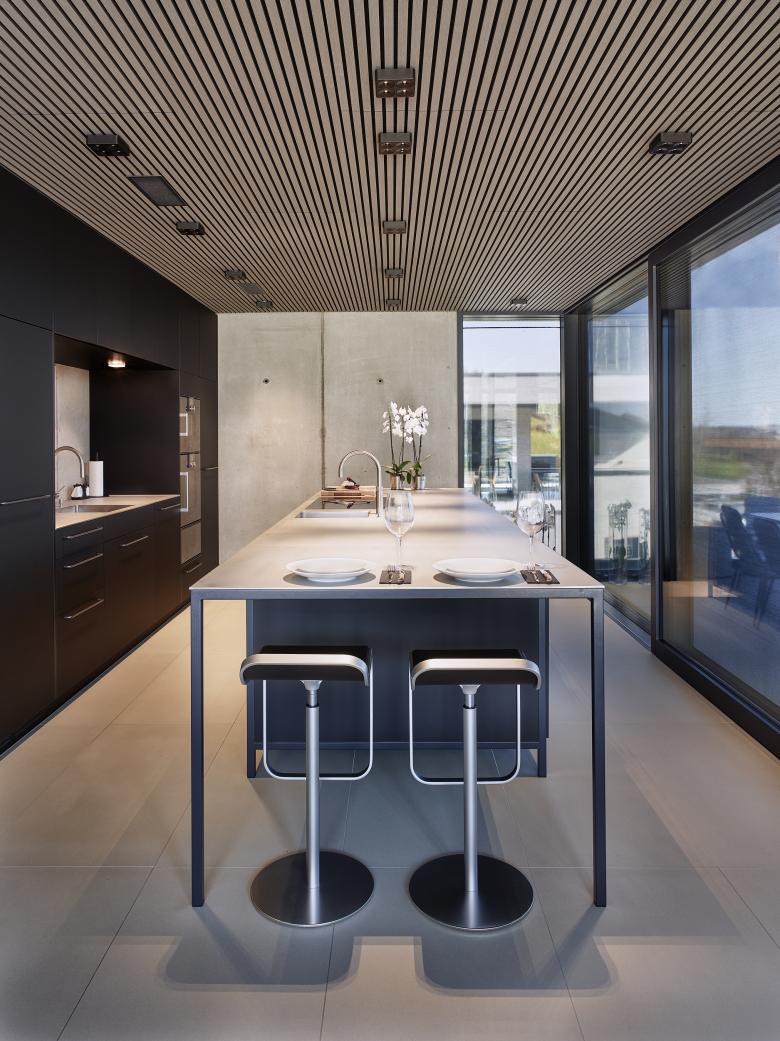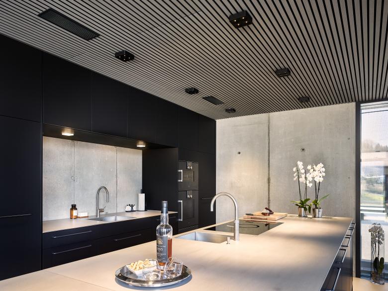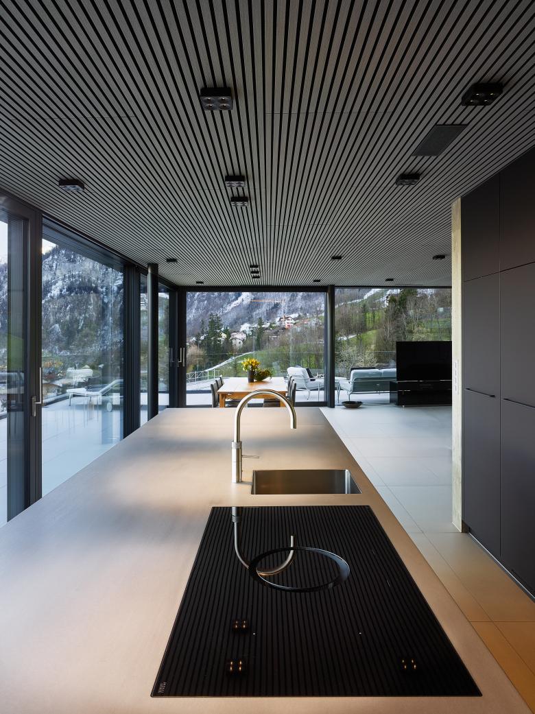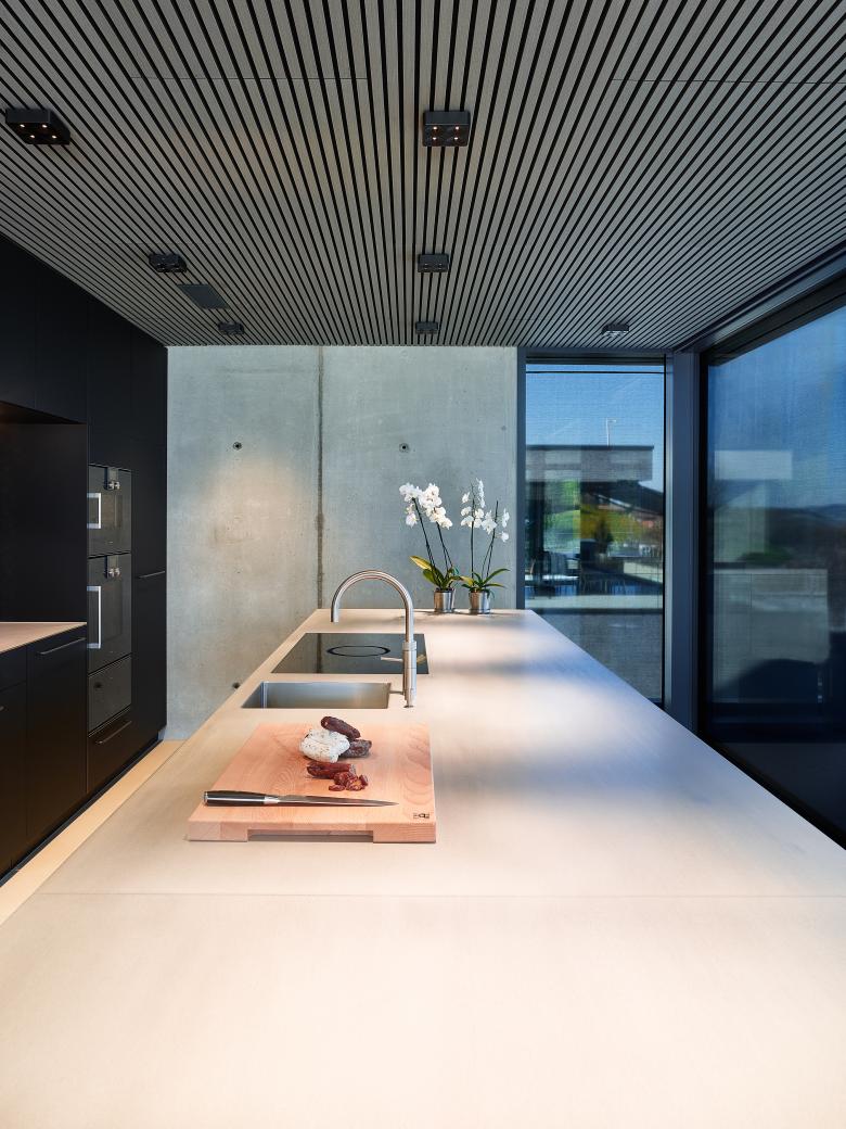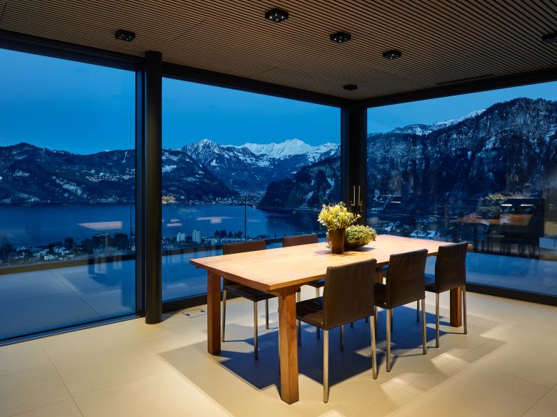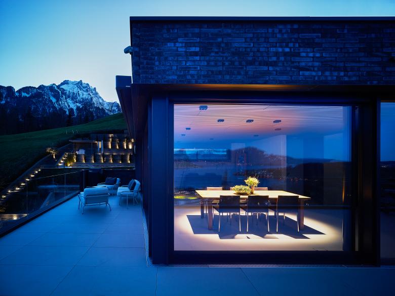 Außen schwarzer Sichtklinker, innen helle Leichtigkeit: Entworfen vom Kernser Büro architektur3 ag, erhebt sich der stilvolle Bau an einem östlich ausgerichteten Hang. Befindet man sich im Inneren des Einfamilienhauses oder auf einer der Terrassen, eröffnet sich eine fantastische Aussicht über See und Berge. Um diese großzügig freizugeben und die Räume möglichst weitläufig zu gestalten, arbeiteten die Architekten mit großen Fensterflächen. Die zurückhaltende Materialität und Farbgebung in den Innenräumen verstärkt den Effekt zusätzlich. So wurden zum Beispiel innen und außen die gleichen, großformatigen Fliesen eingesetzt, um den Außenbereich der Dachterrasse als Wohnraumerweiterung spürbar zu machen. Eine dezente Farbgestaltung und Sichtbetonwände bilden den ruhigen Hintergrund für die hochwertige Möblierung und Beleuchtung. Leuchten von Nimbus greifen das Spiel mit sattem Schwarz und hellen Tönen auf: Im Wohngeschoss korrespondieren Nimbus Q FOUR-Leuchten mit den schwarzen Küchenfronten. In Bad und Schlafzimmer setzen Leuchten aus der Nimbus CUBIC-Familie lichte Akzente. Auch in den anderen Räumen kommen insgesamt zwölf verschiedene Nimbus-Leuchtenmodelle zum Einsatz. Das Zusammenspiel aller Komponenten erzeugt in den Räumen eine rundum ausgewogene, elegante Atmosphäre, die fast überall vom malerischen Panorama flankiert wird.