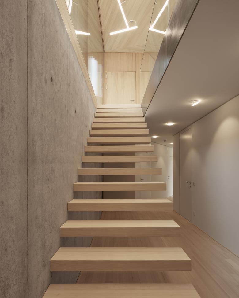 Ein atemberaubender Ausblick auf den Bodensee und die Berglandschaft, dazu ein dreiecksförmiger Grundstückszuschnitt in Hanglage – das waren die Gegebenheiten, die Berktold Weber Architekten aus Dornbirn für die Planung dieses Einfamilienhauses am Rande eines kleinen Dorfes vorfanden. Daraus entstanden ist eine klare, nachhaltige Architektur. „Das Haus ist auf beiden Ebenen erschlossen, in Hinblick auf eine spätere Nachverdichtung ist eine Teilung in zwei Einheiten möglich“, erklärt Architektin Helena Weber. Positioniert wurde der moderne, detailgenau vorgefertigte Holzbau mit seiner eher geschlossenen, rückwärtigen Seite zum Berg. Nach vorne, zum Dorf hin, öffnet er sich mit einer großzügigen Glasfassade. Das Haus vereint dabei modernste und energieeffiziente Haustechnik mit dem Einsatz regionaler Materialien wie geseifter Weißtanne oder Schwarzachtobler Naturstein. Betonelemente sowie vorwiegend in Weiß und Schwarz gehaltene Innenausbauelemente ergänzen das harmonische Zusammenspiel der Materialien und geben den Räumen ein ruhiges, im besten Sinne zurückhaltendes Erscheinungsbild. Innen und außen passten insgesamt 74 in das BUS-System des Hauses integrierte Nimbus Modul R 36-Leuchten perfekt zur Gesamtästhetik. Architekten, Fachplaner und Bauherren entschieden sich für die Leuchten wegen ihres „dezenten Erscheinungsbildes, ihrer guten technischen Qualitäten, dem durchgängigen Design und der flexiblen Einsatzmöglichkeiten“.