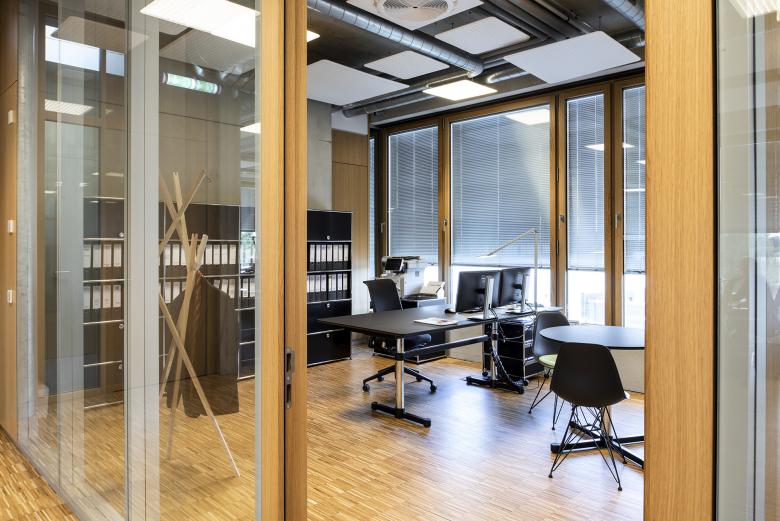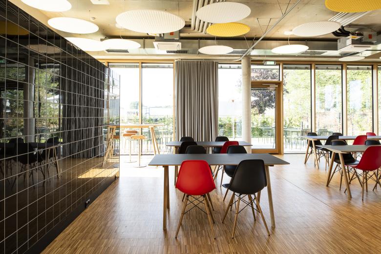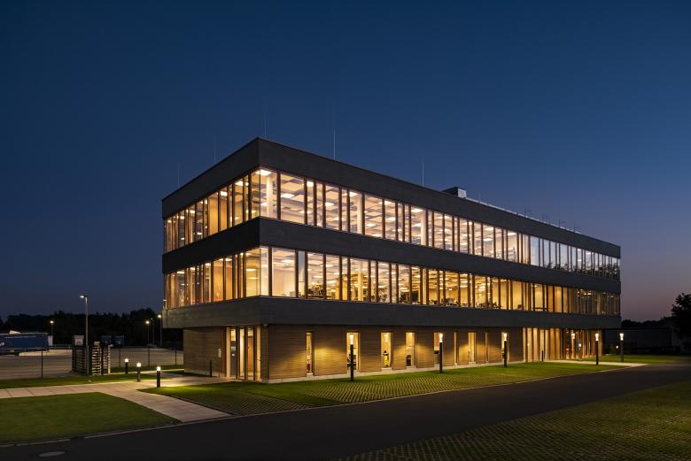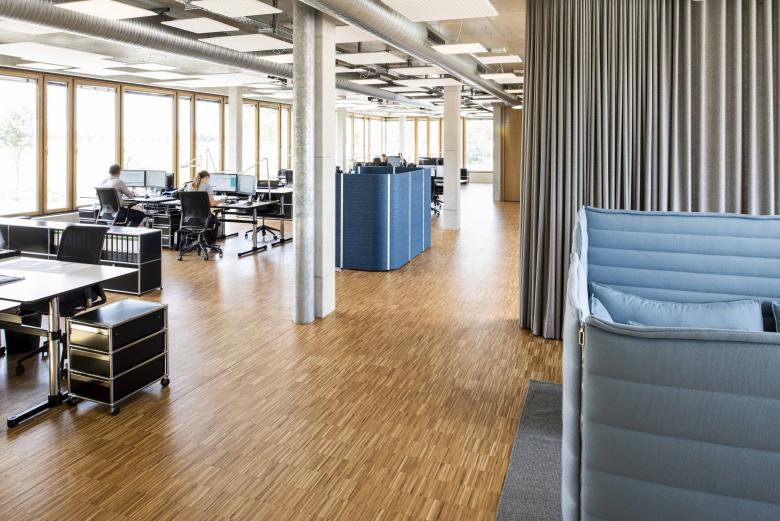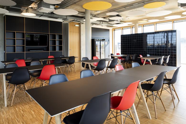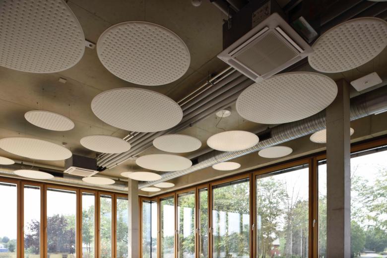 Nachhaltig und umweltfreundlich zu sein – das ist der Anspruch der Paneuropa Transport GmbH an sich selbst. Der Bremer Einrichtungsspezialist POPO hat für die neue Unternehmenszentrale des Logistikprofis in der niedersächsischen Gemeinde Bakum nach diesen Maßgaben eine Büro- und Arbeitsplatzatmosphäre geschaffen, die sich an den Bedürfnissen des Unternehmens und seiner Mitarbeiter orientiert. Den Rahmen dafür bildet ein dreistöckiges Gebäude, das mit seinen umlaufenden, geschosshohen Verglasungen einen weiten Blick in die Umgebung freigibt. Während die Mitarbeiter früher in einer kleinteiligen Bürostruktur arbeiteten, öffnen sich ihnen am neuen Standort großzügige Flächen, die als Gruppenbüros dienen, es gibt Teeküchen auf allen Etagen, Lounges, und eine Kantine mit Außenbereich oder Sofas, die zu Besprechungsinseln zusammengestellt werden können. POPO entschied sich, den roh belassenen Sichtbetondecken eine zweite, gleichermaßen ästhetische wie funktionale Ebene zu geben: Als zarte, durchlässige Struktur sind Raumakustik-Elemente von Rosso und Leuchten von Nimbus von den Decken abgehängt. In den Arbeitsbereichen kommen Deckenabsorber aus dem Rossoacoustic Pad System in Kombination mit dazu passenden Modul Q Project Leuchten zum Einsatz. Bei Bedarf können die Mitarbeiter an den Schreibtischen zusätzlich Roxxane Office Tischleuchten von Nimbus nutzen. In der Kantine sorgen runde, teils farbige Nimbus Modul R Project-Pendelleuchten und Rossoacoustic PAD R-Absorber für eine fröhliche Atmosphäre. Das Ergebnis der Planungen von POPO ist nicht nur eine zeitgemäße Optik. Unterstützt durch passende Raumakustikmaßnahmen und angenehme Beleuchtungsverhältnisse hat sich auch die Arbeitsweise für die Beschäftigten hin zu einem offeneren Miteinander verändert.