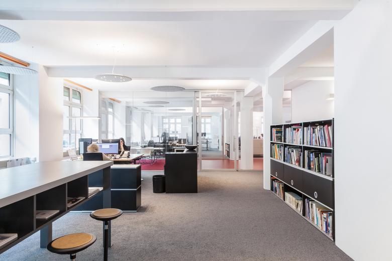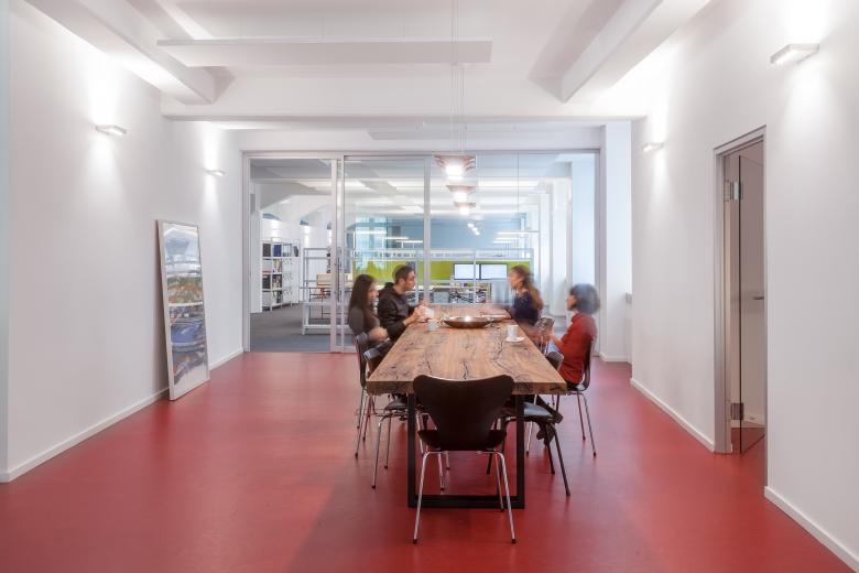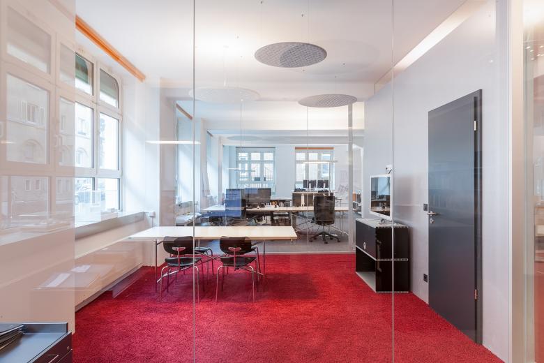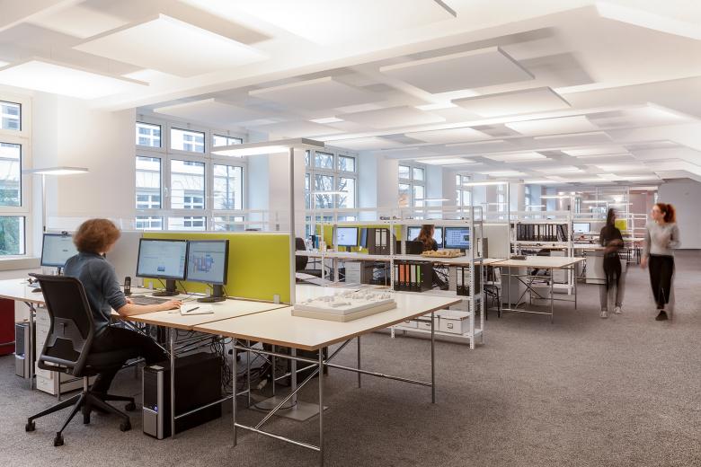 Nicht nur die Arbeitsfläche, sondern auch die Möglichkeit zum Austausch wollten die beiden etablierten Stuttgarter Architekturbüros weinbrenner.single.arabzadeh. und ORANGE BLU miteinander vergrößern: „Gemeinsames Ziel war es, im Rahmen der Erweiterung beider Büros an zentraler Stelle eine gemeinsame Mitte zu schaffen“, beschreibt Frank Marohn, Büroleiter von weinbrenner.single.arabzadeh. in Stuttgart. Beide Büros mieteten zusammen Räume im Stuttgarter Westen an. Ein auf Maß gefertigter, sechs Meter langer Holztisch aus Alteiche dient nun als zentraler Ort für gemeinsames Essen, Kommunikation und Feiern. Alle Besprechungsräume, zwei Druckzentren und weitere gemeinsame Einrichtungen werden von den beiden Büros synergetisch genutzt. ORANGE BLU und weinbrenner.single.arabzadeh. legen Wert auf ausgereifte Lösungen für funktionale Zusammenhänge, eine sorgfältigen Auswahl der Materialien und eine technische Ausstattung auf der Höhe der Zeit. Nicht zuletzt deswegen setzten die Architekten bei der Neugestaltung ihrer Büroflächen überwiegend auf Produkte von Nimbus: “In unseren Augen zeichnen diese Produkte sich durch eine hervorragende Lichtqualität, ein stimmiges Design und dies verbunden mit der überzeugenden Funktion aus“, so die Architekten.