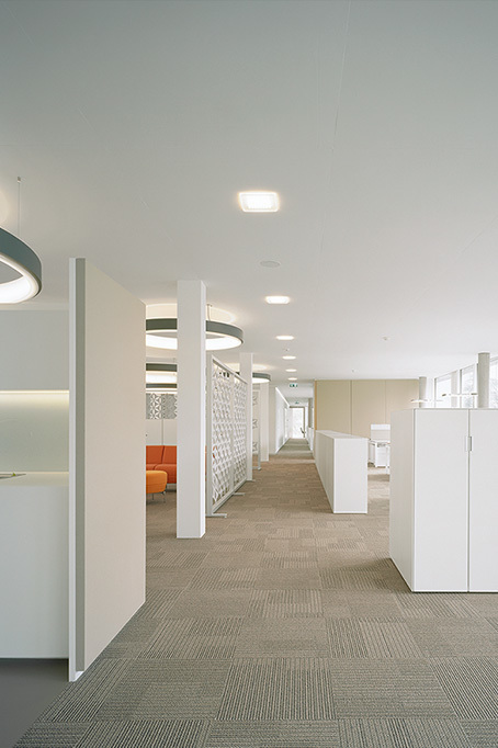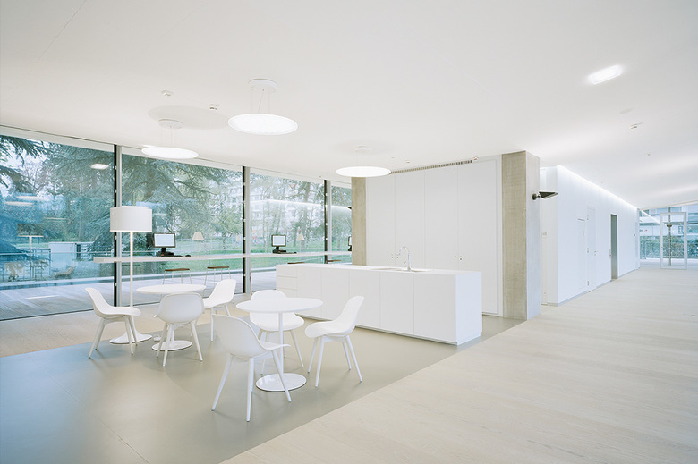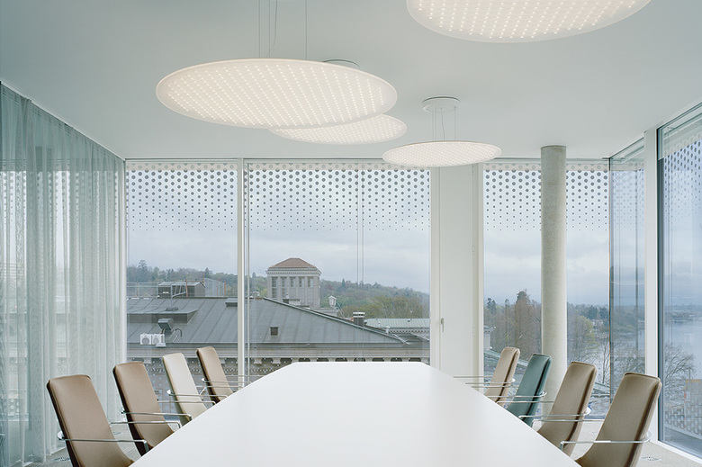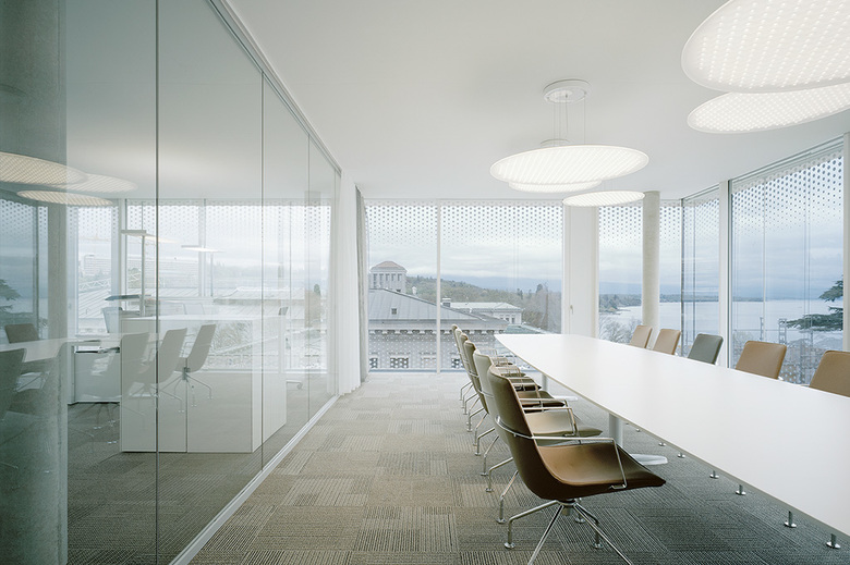 Idyllisch in einem Park am Genfer See gelegen schwebt das Erweiterungsgebäude der WTO in gläserner Klarheit über einem erdgebundenen, zurückspringenden Sockel. Der riegelförmige Bau ergänzt die Bestandsgebäude der Organisation mit gebührendem Abstand. Eine gläserne Fußgängerbrücke, die direkt in die zentrale Lobby führt bildet dabei die Verbindung. Geprägt ist das lichtdurchflutete, durchlässige Gebäude durch die Transparenz der Gebäudehülle und seine stringente Struktur: Während in den Obergeschossen Büros und Verwaltung untergebracht sind, befindet sich im Sockel neben der Lobby ein Restaurant mit Terrasse. Dank seines ausgeklügelten Energie- und Lüftungskonzepts unterschreitet das Gebäude die gültigen »Minergie-P« Energie-Standards. Teil davon ist auch die Ausstattung des Baus mit Leuchten von Nimbus. Neben den energetischen Aspekten überzeugte wittfoht architekten aber auch ihre Ästhetik und Lichtqualität: „Die Nimbus LED-Leuchten tragen zu der ganz besonderen Raumatmosphäre im WTO Erweiterungsbau wesentlich bei und werden von den Mitarbeitern sehr positiv aufgenommen.“ betonen sie.