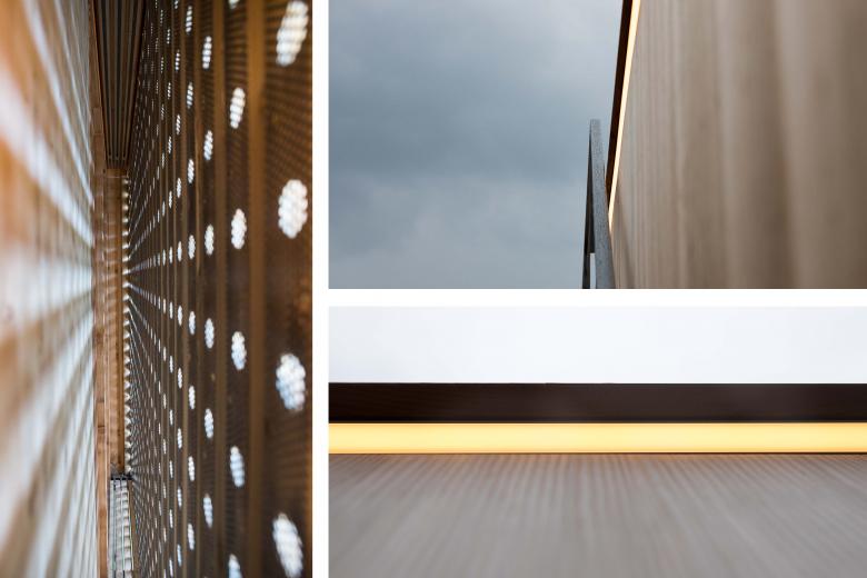Gelochte, hinterleuchtete Plattenelemente als Deckenbeplankung und Schiebeelemente als offenbare Trennung von Plattform und Bootsgarage zaubern im Dunkeln eine subtile Lichtstimmung über dem Wasser.