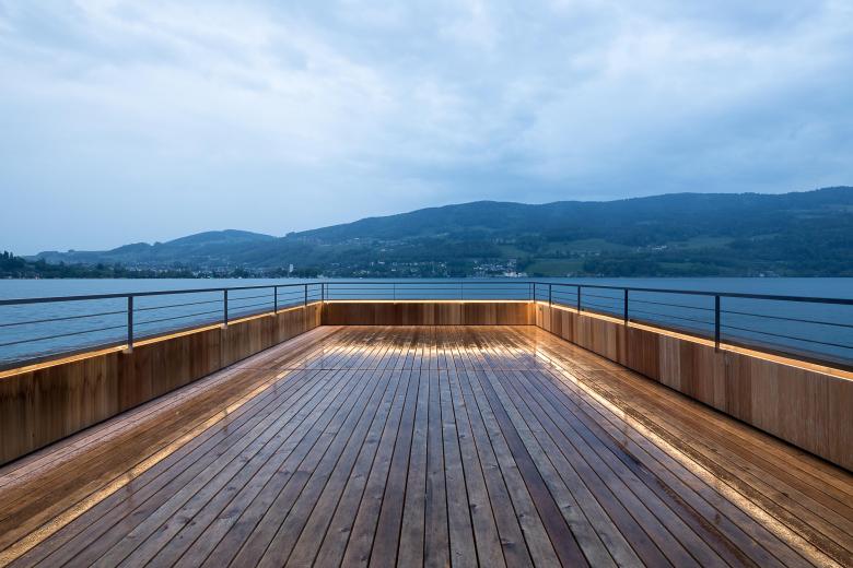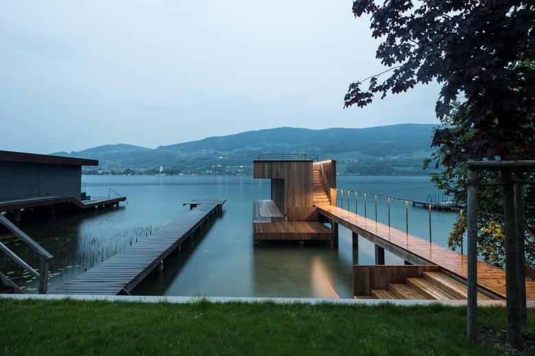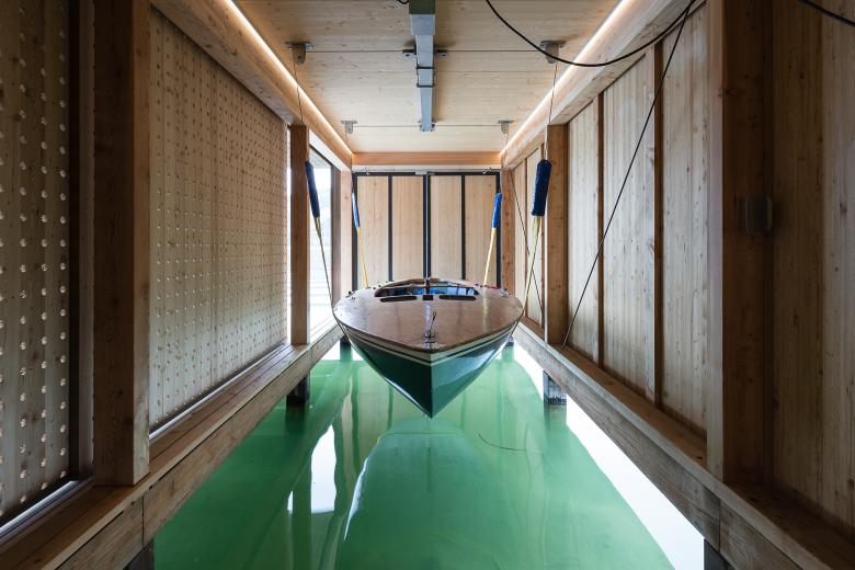 Die Aufgabenstellung bei diesem Projekt bestand darin, einen Bestandsbaukörper in Form eines liegenden, im Wasser stehenden Kubus durch gezielte und präzise gesetzte Massnahmen in seiner Funktion und Aussagekraft zu verändern und zu einem skulpturalen Element im Wasser auszuformen. Mittels einer stegartigen Brücke ist das Bootshaus mit dem Landhaus verbunden. Von diesem Brückenniveau führt der Zugang in direkter Linie über eine Treppe auf das Sonnendeck. Darunter am Wasser teilen sich Bootsgarage und die eingeschnittene Schwimmplattform die Fläche. Materialtechnisch ist der gesamte Körper mit astreinenLärchenholzplatten bekleidet, welche durch ihre Verarbeitung das skulpturale Erscheinungsbild verstärken.