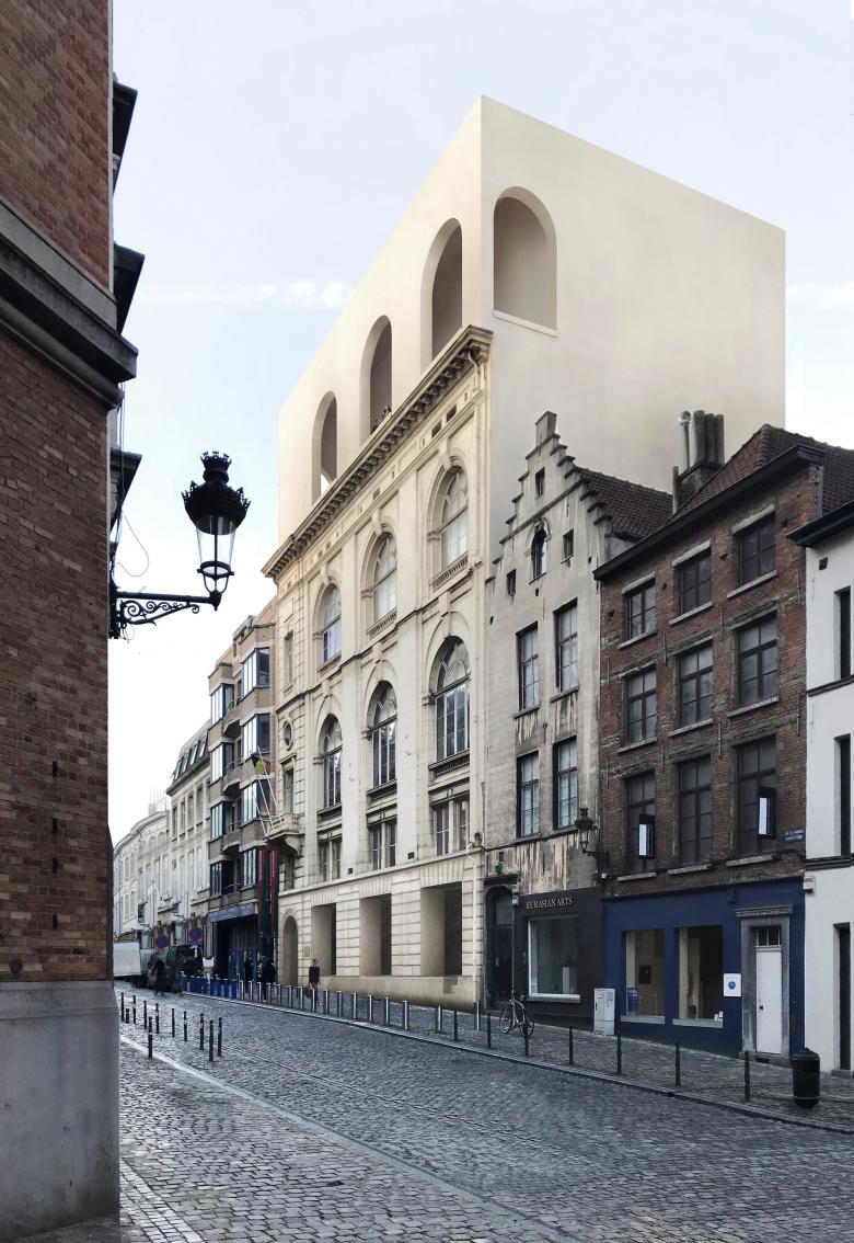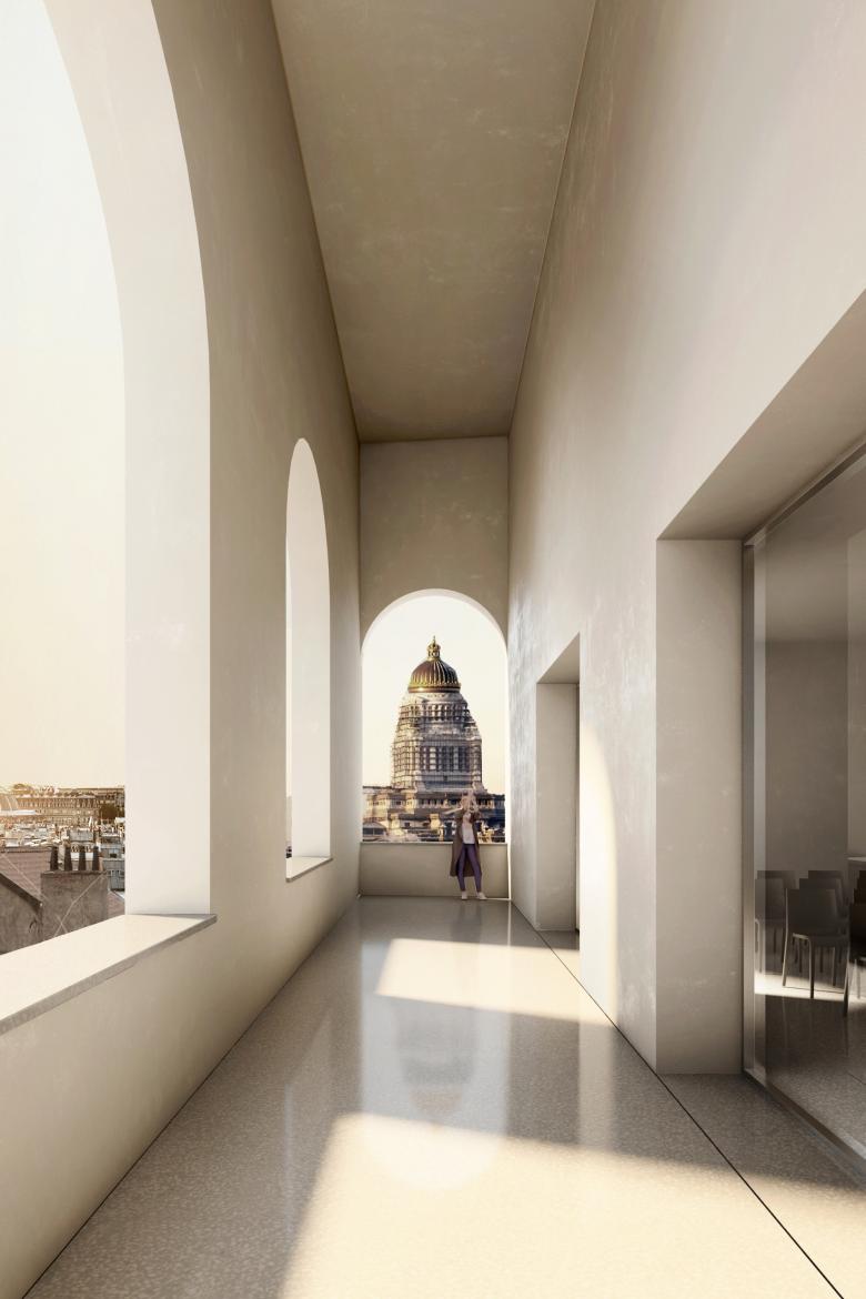 Last floor hosts a multipurpose space for 250 people, which opens to an exterior loggia that filters the relationship with the city of Brussels. The project maintains the existing façade of the building, which gets crowned with the new belvedere and offers magnificent views of the Palace of Justice and the Marolles.