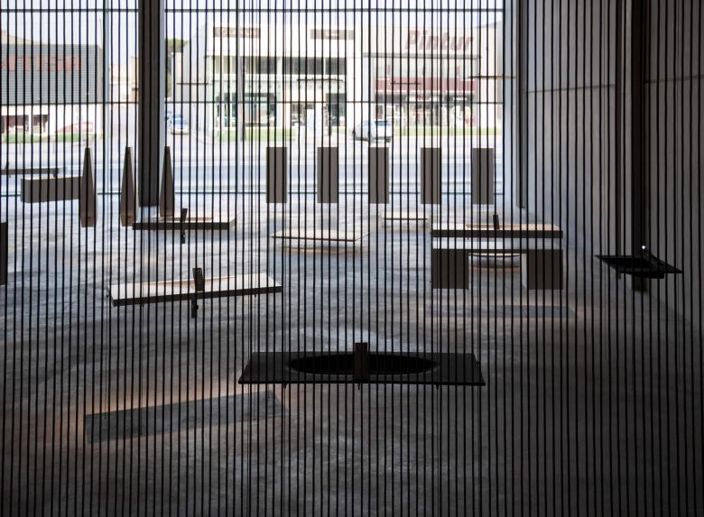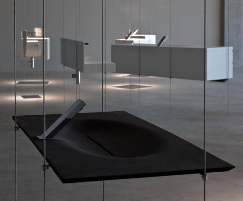 Shadows are neatly ordered, reinforcing the visual sense of levitation introduced by supporting the toilets with tensioned steel threads.