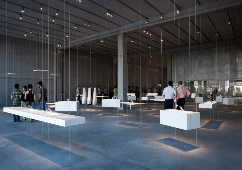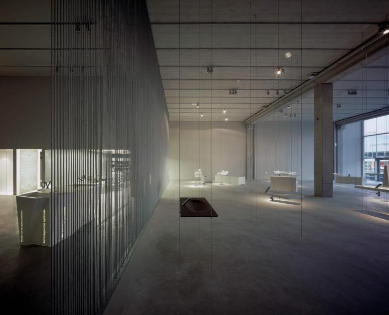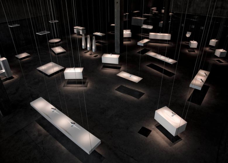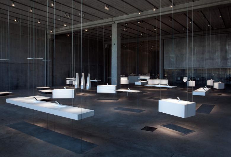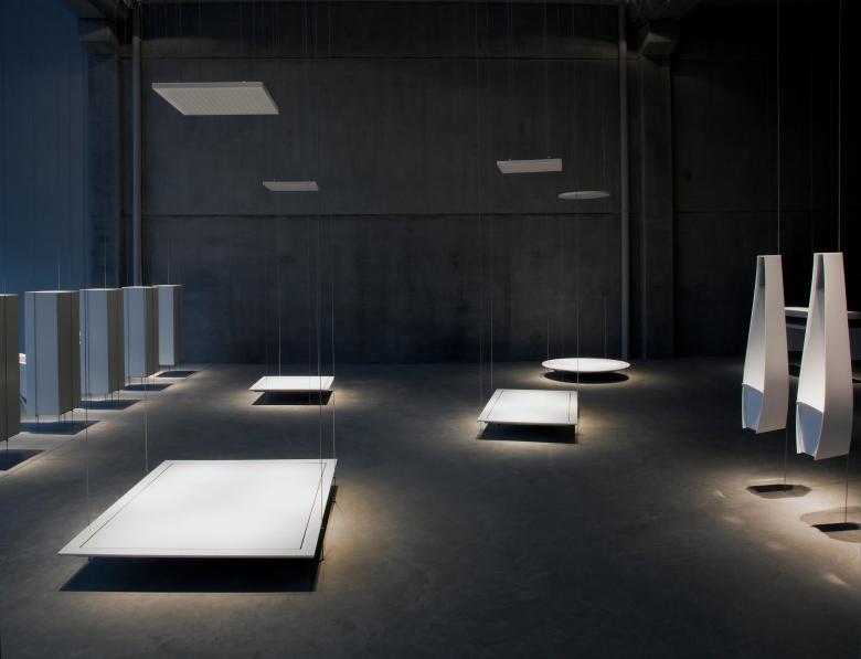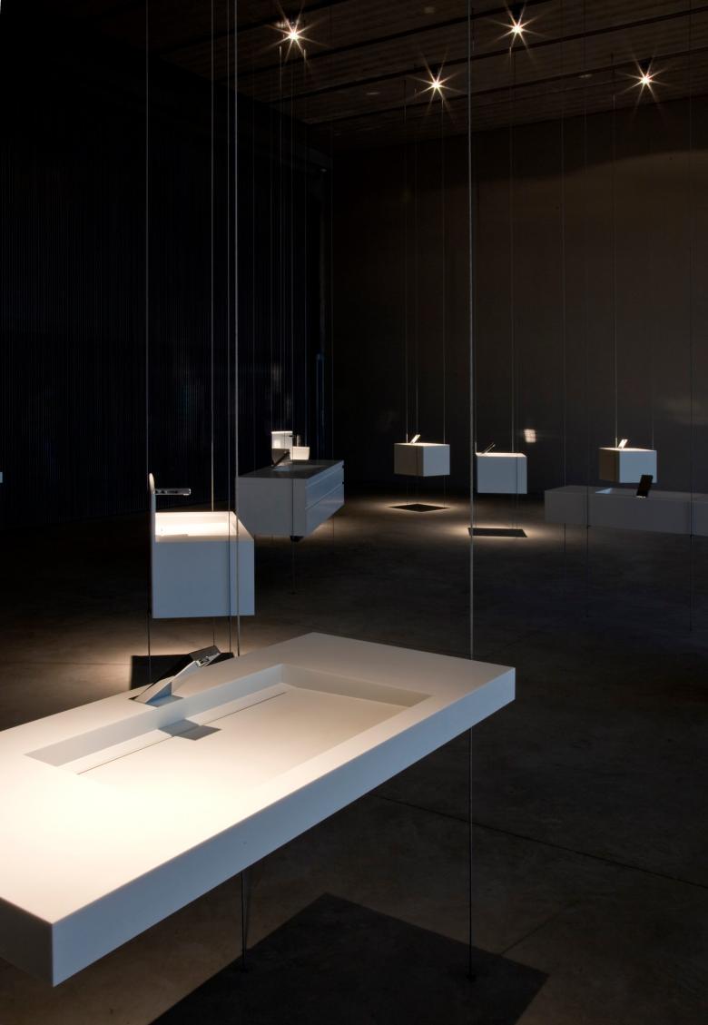 The lighting concept was to treat the background as part of the object. The shadow becomes an essential element of the object, the same way that, in a Japanese Zen garden, the rocks, moss, and sand or gravel join together in a single, unified space. The overall effect is one of peace and elegant simplicity, as well as beauty. The lighting design creates a composition of light and shadow; the components are the object on display, its shadow, and the way the light touches the floor. A line of lights attached to the ceiling and halogen lamps of very narrow beam illuminate each object from above, creating a shadow directly below it on the floor.