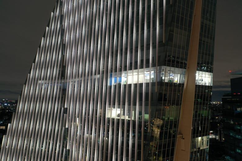 On the façade, the 4000ºK luminaires with Blade-like beam of light slats, customized specially for the project, precisely illuminate the width of the mullion and produce no light contamination/intrusion. During the day they are unnoticeable due to their small size and integration. As well as the lighting composition, dynamism was added by using a DMX controlled media façade so that the building achieves empathy with the surrounding urban rhythm.