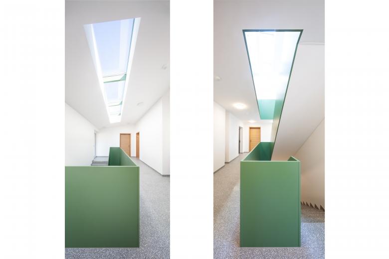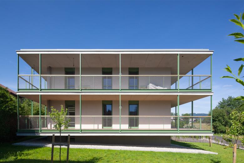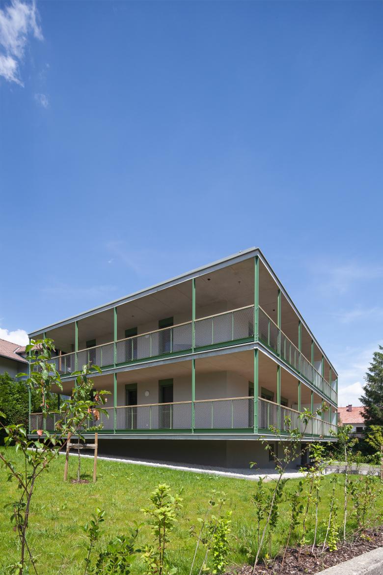Nebenräume, darüberliegend zwei Wohngeschosse mit angrenzendem Gemeinschaftsgarten und Kinderspielplatz.