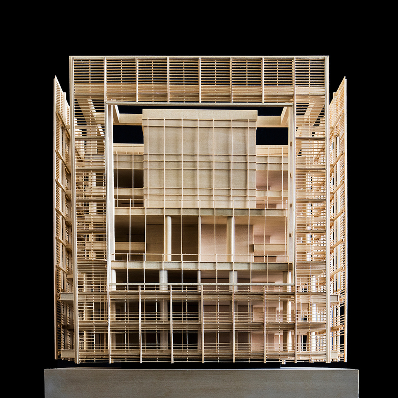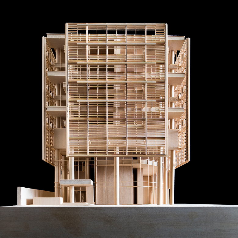 Lightness and transparency of the tower and base are the primary goals, not only to reduce the apparent scale and mass in the context of the low to mid-rise neighborhood, or the scale-less reflective towers in the area, but to express the optimism, openness, and energy of the more secular modern character of Tel Aviv. The delicate louver screen is an elegant white “veil,” inspired by the ventilated protective layers of more traditional Middle Eastern clothing. It both defines and obscures the distinction between the public image of the building and the private realm within. The louver elements of the screen protect the delicate clear glass skin, and have local architectural precedents in the ubiquitous “treeseem”, the sliding louver blinds enclosing open air porches or negative spaces so common in the existing neighborhood Bauhaus buildings.