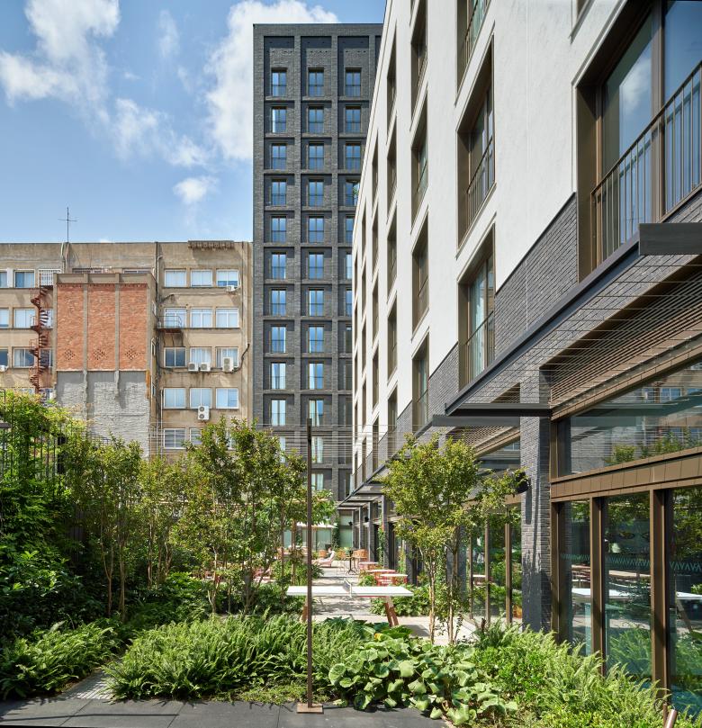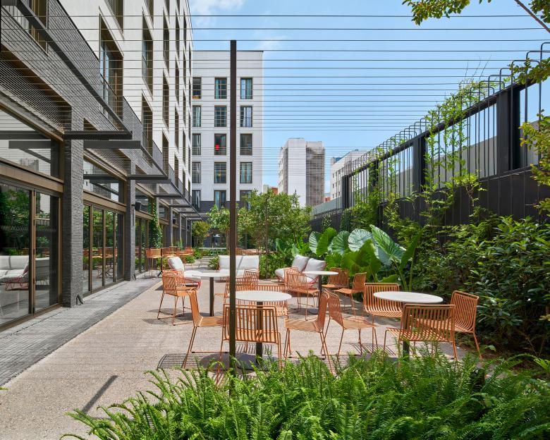 The project stratifies the height of the spaces for collective enjoyment. While the interior garden on the ground floor is a space for exchange accessible to visitors and the university community, on the 6th floor there is a raised garden overlooking Poblenou with a longitudinal open swimming pool, a space dedicated to the leisure and stay of the residents, with shrub vegetation, trees and integrated furniture to enable different uses and seasonal experiences.