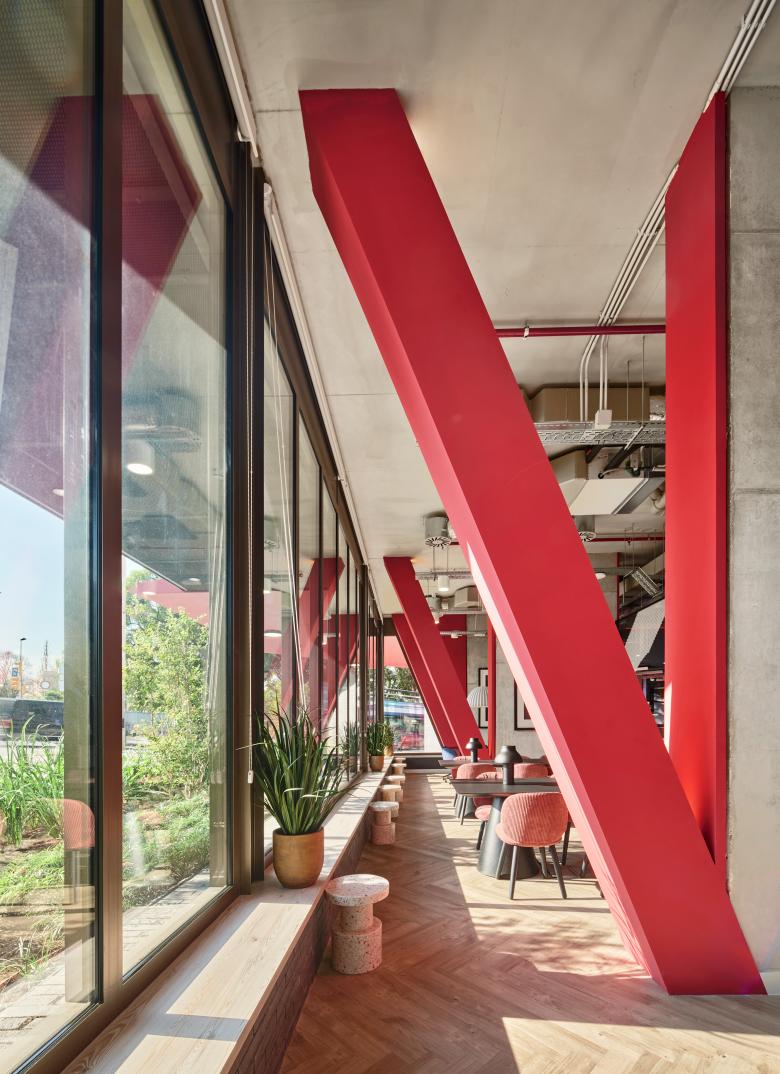 The entrance to the building on the Meridiana-Sancho de Ávila corner is accentuated by a large red canopy over the public area and a longitudinal bench that resolves the topography, creating an outdoor meeting point. On the same entrance area, a metal bench integrated into the door establishes a waiting area, prior to the access to the vestibule that leads to the communal areas.