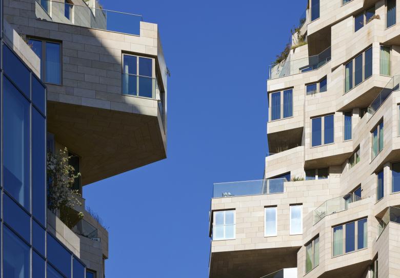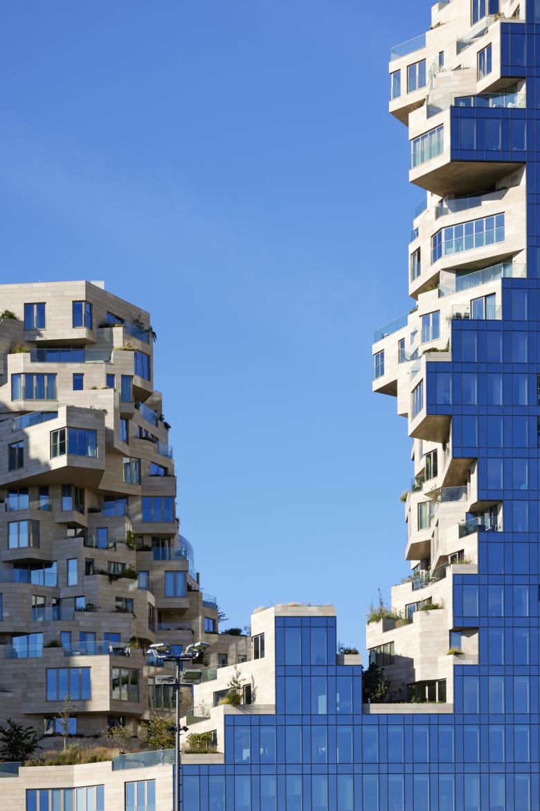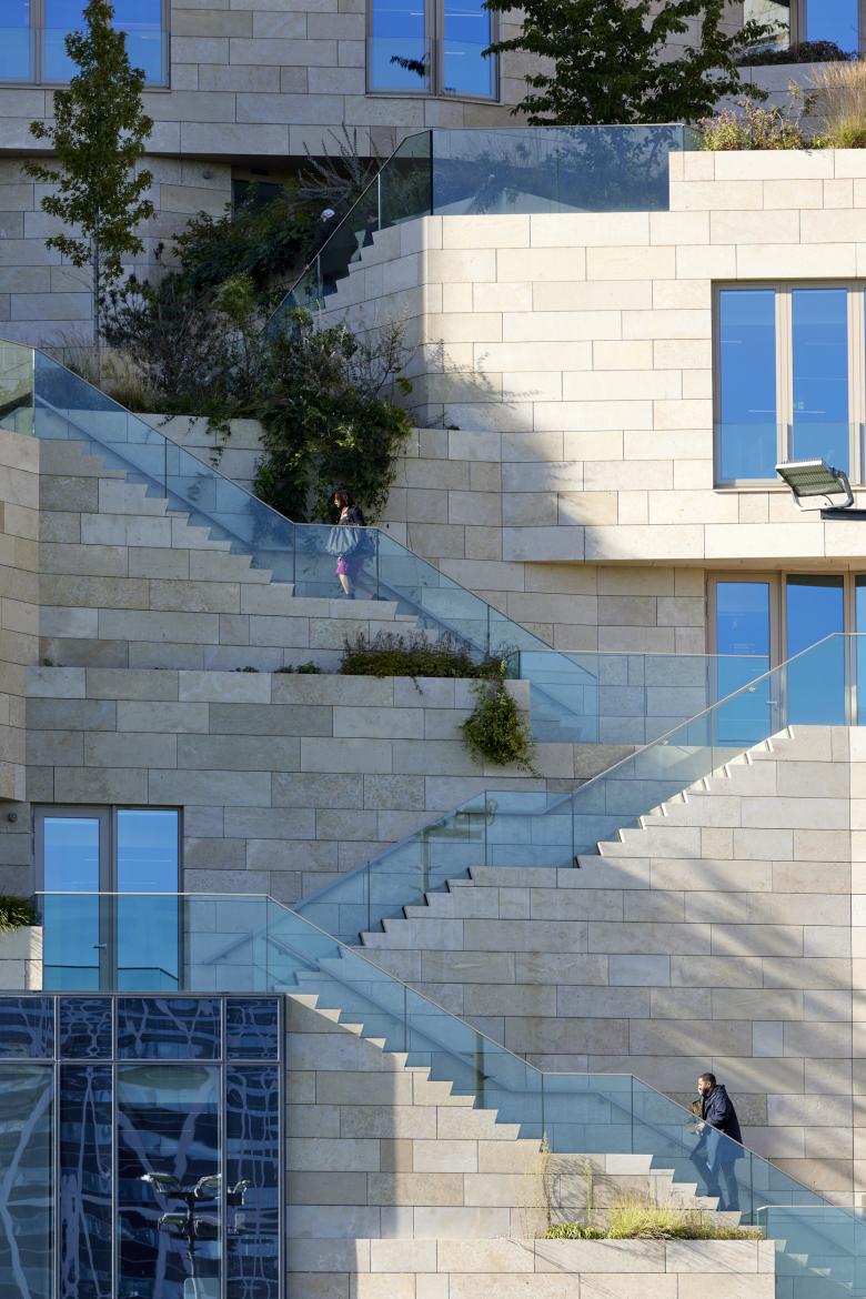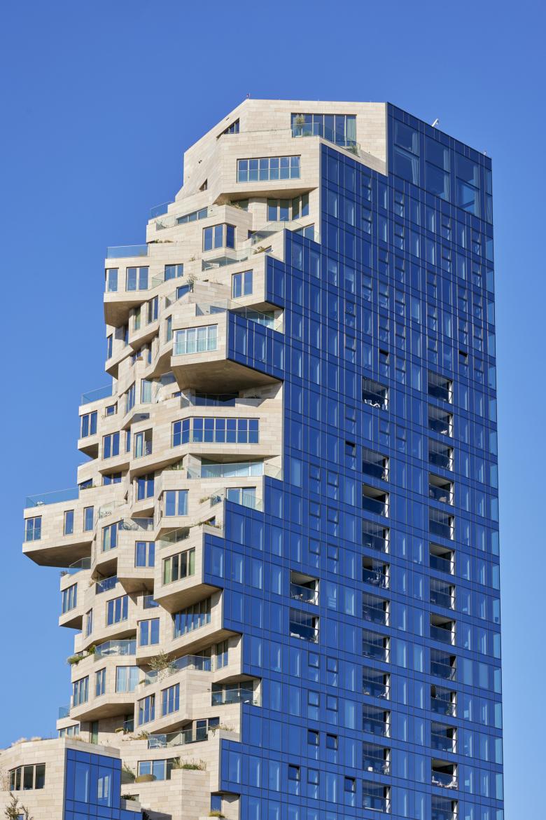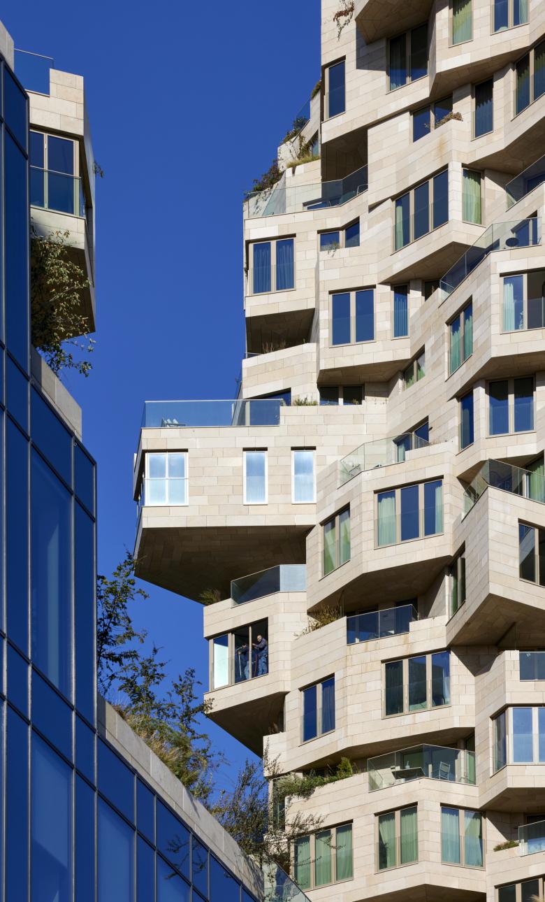 Valley, the dramatic, geology-inspired, plant-covered high-rise designed by MVRDV for developer Edge, was officially opened in a ceremony on Friday. The 75,000-square-metre building, which was recently declared the world’s best new skyscraper by the Emporis Awards, stands out in Amsterdam’s Zuidas neighbourhood with its three towers of 67, 81, and 100 metres and its spectacular cantilevered apartments. The building distinguishes itself in several ways: firstly, it combines offices, shops, catering, cultural facilities, and apartments in one building; secondly, unlike the closed-off buildings elsewhere in the Zuidas, the green valley that winds between the towers on the fourth and fifth floors is accessible to everyone via two external stone staircases. The building’s extensive planting, designed by landscape architect Piet Oudolf, hosts approximately 13,500 young plants, shrubs, and trees. As these mature over the coming years, they will give Valley an increasingly green appearance, making the building a manifesto for a greener city.