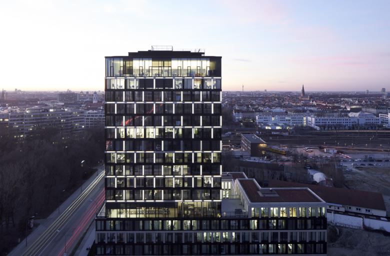 Das HIGHRISE one ist ein moderner Bürokomplex mit Penthouse, dessen Silhouette auch in der Nacht weithin sichtbar in den Stadthimmel am Münchner Ostbahnhof strahlt. Ein zentrales Gestaltungselement des Hochhauses ist die Außenfassade, dessen Farbkonzept der Berliner Künstler Erich Wiesner in Kooperation mit steidle architekten entwickelt hat. Um das schwarz-weiße Farbenspiel durchgängig sichtbar zu machen, wurde ein spezielles Beleuchtungskonzept von Tropp Lighting Design entworfen. Geschosshohe Fassadenprofile, die hinterleuchtet sind, illuminieren die linearen Raster mit Beginn der Dämmerung und vermitteln eine transparente Leichtigkeit der Baukörper.