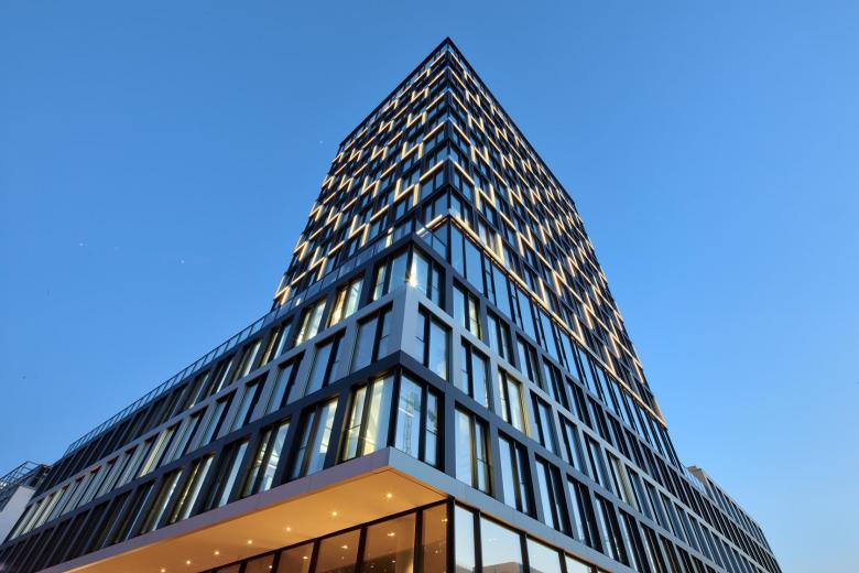 Die Lichtplanung folgt den Leitlinien der Architekten und des Bauherrn, der Reiß & Co München GmbH und setzt diese systematisch um. Die Innenbeleuchtung ist auf die Außenwirkung abgestimmt, warme Lichtfarben unterstreichen das Gesamtbild und bringen die zweigeschossige Eingangshalle mit Lobby zum Leuchten. In den Büros unterstreicht ein strenges Raster aus linearen Pendelleuchten, die an der Fassadenachse ausgerichtet sind, die nächtliche Fernwirkung des Hochhauses. Das Zusammenspiel von Schwarz und Weiß wird im Innern der Gebäude konsequent weitergeführt und mit modernen Lichtlösungen wirkungsvoll inszeniert.