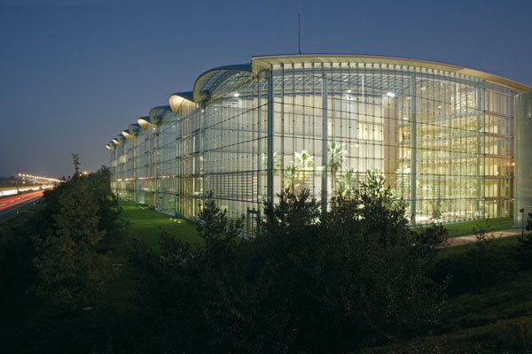 Das neue Verwaltungsgebäude der Lufthansa AG befindet sich in exponierter Lage direkt am Frankfurter Flughafen, zwischen Autobahn und ICE-Strecke. Die Vorgabe lauteten, an dem stark frequentierten Ort hochwertige und kommunikative Büro- und Arbeitswelten zu realisieren. Unter dem an einen Paraglider erinnernden Dach liegen 1.850 Büroarbeitsplätze, aufgeteilt auf einzelne Segmente, die von Atrien durchzogen sind.