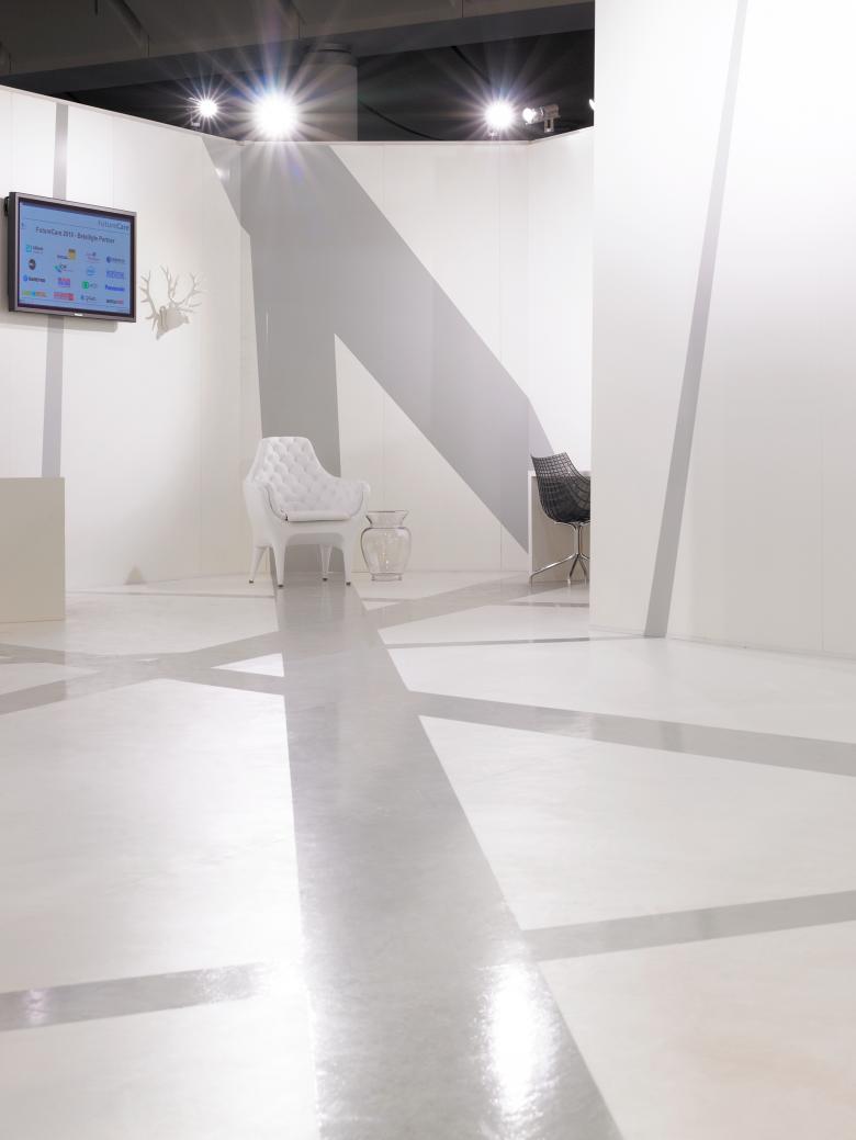 In 2009 real rooms were indicated, in 2010 the networking of the various stops was presented abstractly, with clean white and networked beams of light. In 2011 the stand is optimised in communication terms and characterised by a central lounge.