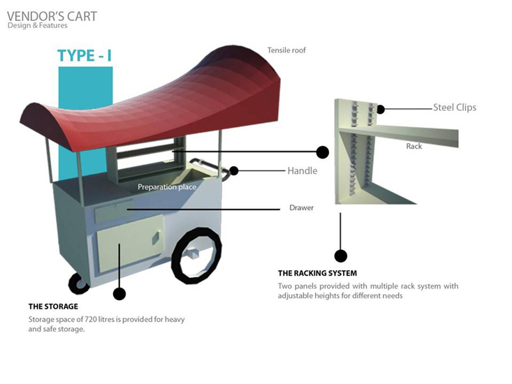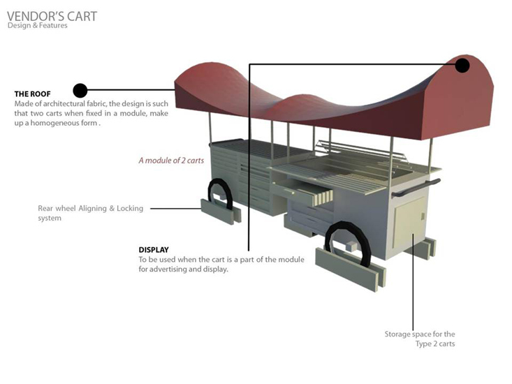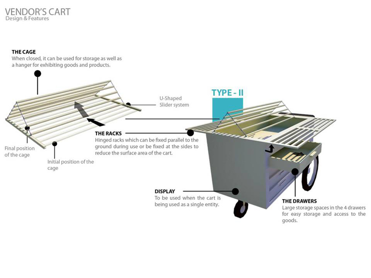 The carts are designed in a modular way to suit the different products that are sold by each vendor. Thus, a unique adjustable racking system along with a locking and aligning system caters to the needs of the vendors as well as the street structure. The modular carts and when joined together act as a homogenous system  and enable vendors to expand in the same fabric of the street.