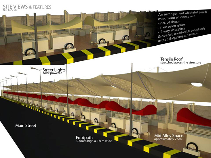 The permanent kiosks line the street wall and are compose of ample storage as well as multi-purpose collapsible Jaalis to cater to the varying needs and uses of the vendors.