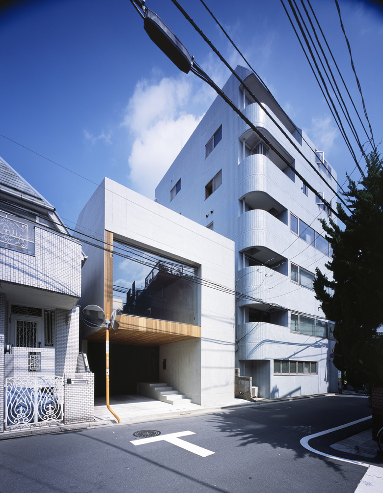 The façade, characterized by a large single pane of glass, is made of RC with randomly arranged FRP formwork, with rain-resistant hardwood "itauba" used for the walls and eaves as an accent, creating an exquisite contrast between wood and concrete.