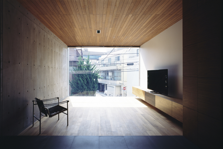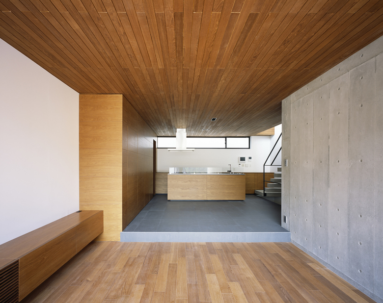 Teak wood was also used for the second floor ceiling, which can be seen through the sash windows, to create a sense of unity with the exterior. Inside, the floors, furniture, and fixtures are all made of teak wood. The light coming through the large openings creates a beautiful gradation of shades on the floor, walls, and ceiling. The third floor free room, which is planned to be used as a children's room in the future, has an outdoor living room of similar size and can be used for large parties by installing a table tennis set and a swimming pool.