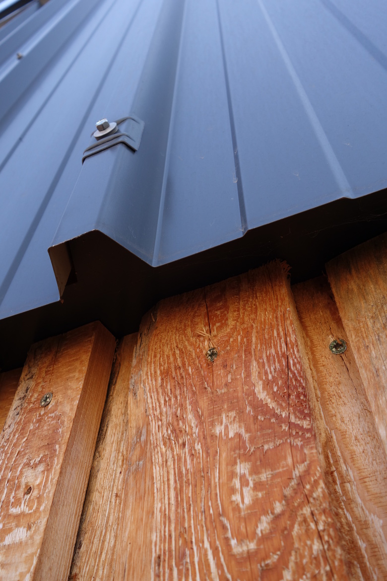 Auf der Straßenebene wurde eine minimale Hülle aus zweiseitig verwendeten Abfallbrettern erstellt. Diese Schwartenbretter werden normalerweise als Hackschnitzel oder Brennholz verwendet da sie die äußere Stammrundung aufweisen. Sie geben dem Sockel eine rauhe natürliche Qualität.