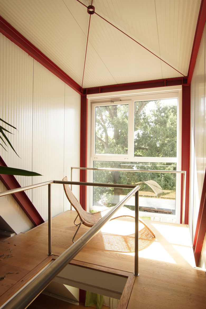 Der Bauherr konnte eine Maschinenbühne in seinem Betrieb vor der Verschrottung retten. Diese dient als Unterkonstruktion für das Holzdeck auf der Südseite. Eine Stahlbrüstung wurde als leichtes spielerisches Stabwerk ergänzt.