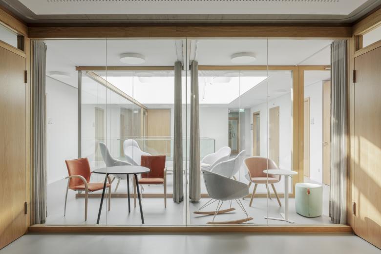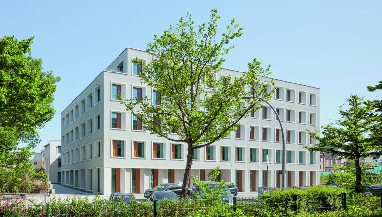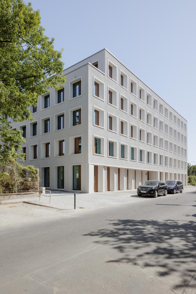 Elegant and sustainable – The new administrative building of the Unionhilfswerk was to make an unpretentious but powerful contribution to the urban structure - with a special focus on sustainability: the building was to blend into its surroundings, offer a high quality of stay, use resources sparingly and age gracefully. The implementation: The new building impresses with its simple elegance and the clear order and rhythm of the openings. The perforated façade is characterised by upright window formats, four-sided circumferential flanges and deep reveals. With its simple and compact volume, the building creates calm in a heterogeneous environment. The features: An atrium connecting all levels with floor-by-floor staggered openings forms the building's centre. The positioning of the building created two small outdoor spaces: as an extended outdoor zone for the conference area and as a communal garden between the nursing home and the administration building.