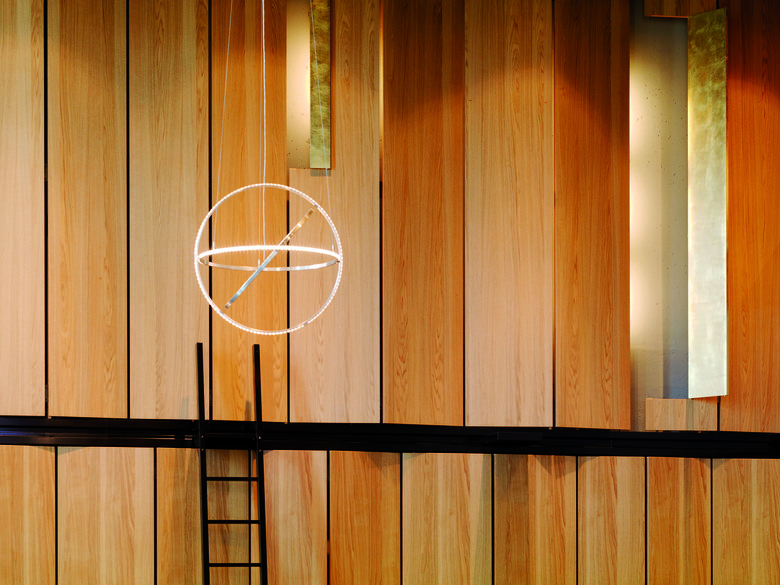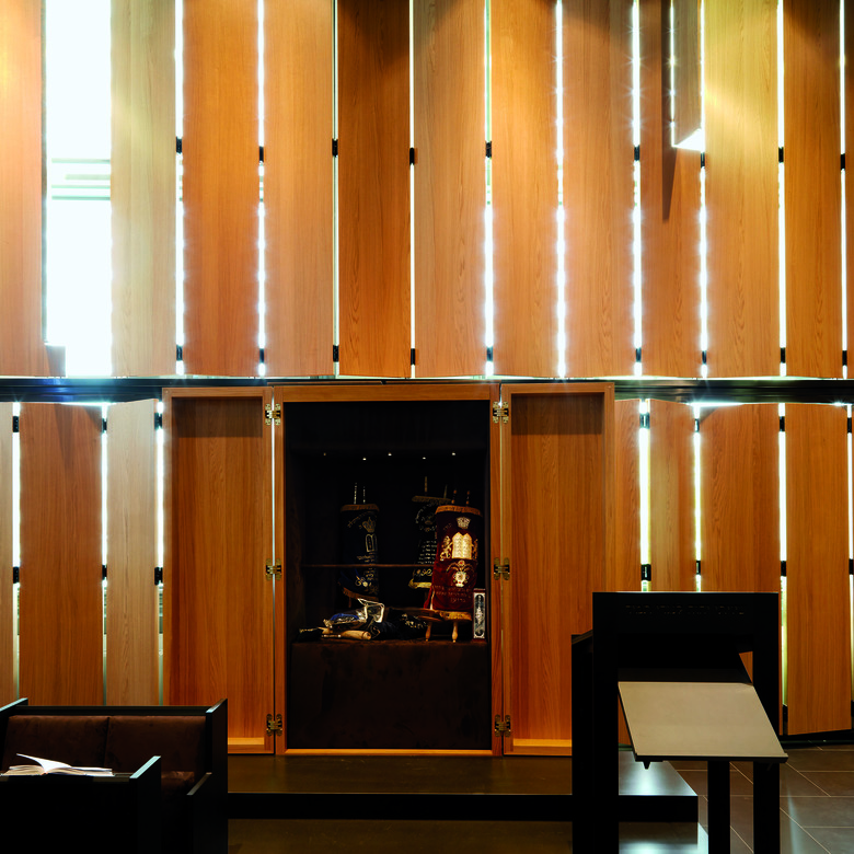 The "back" of the oak wood paneling is gold-plated and can be seen as a special "shining" room from the outside. Inside, there are reflecting and sparkling lights and shadows coming from the flaps in the wooden elements, which are placed at irregular intervals and can be opened and closed.