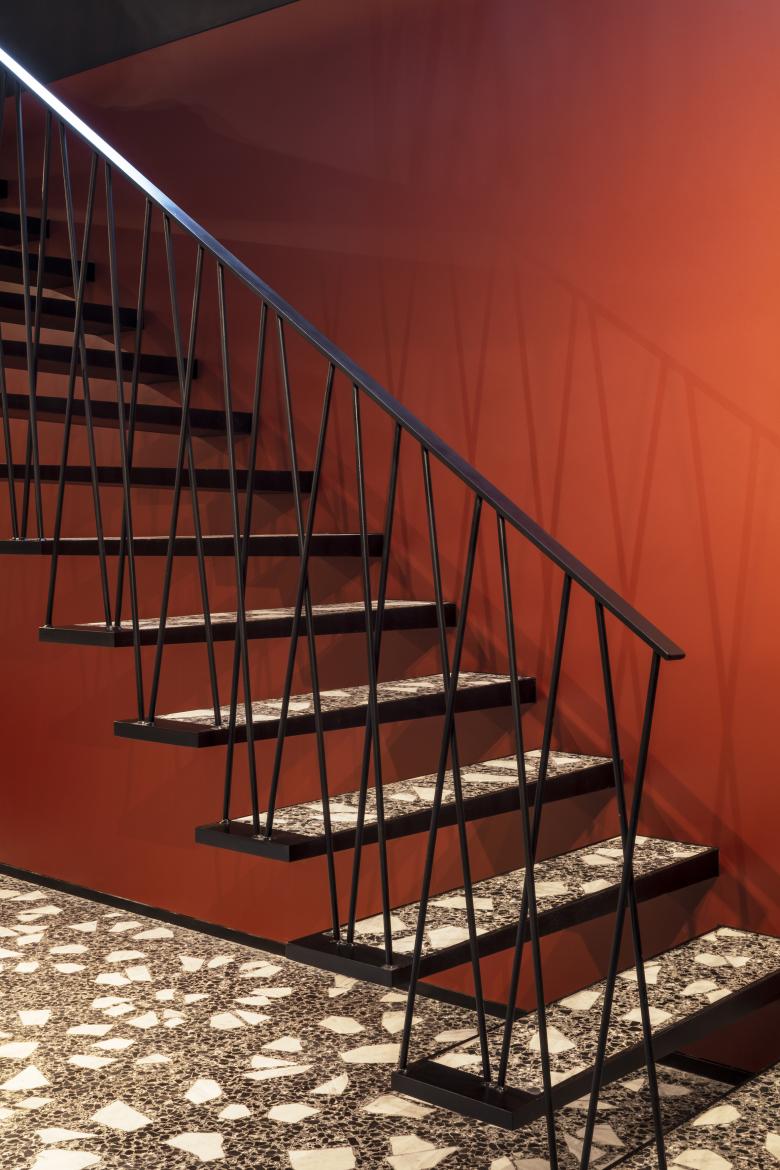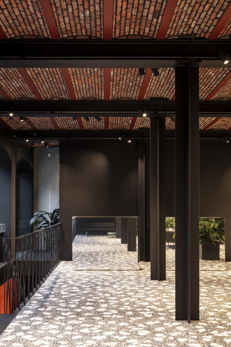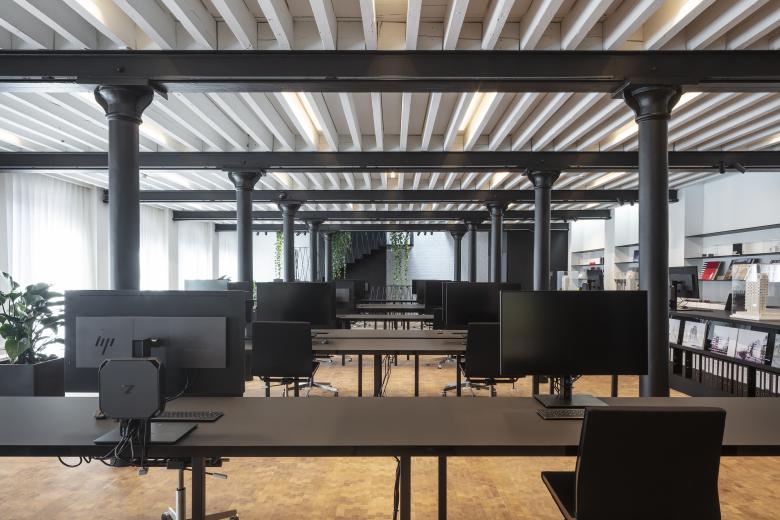 Inside, each floor has its own character: a ground floor meeting floor with terrazzo floor, an underground lunch room with voids on the front wall, a first work floor with wide wooden plank flooring and under the roof with Polonceau trusses, a completely white workspace with cathedral allure is created. The soul of the building is preserved and together with the finish, forms a powerful whole.
