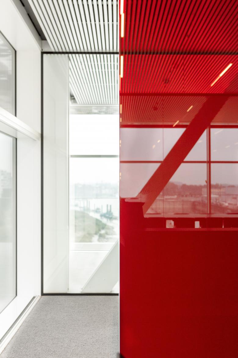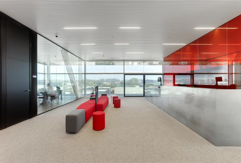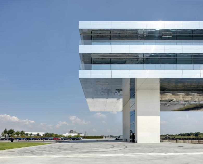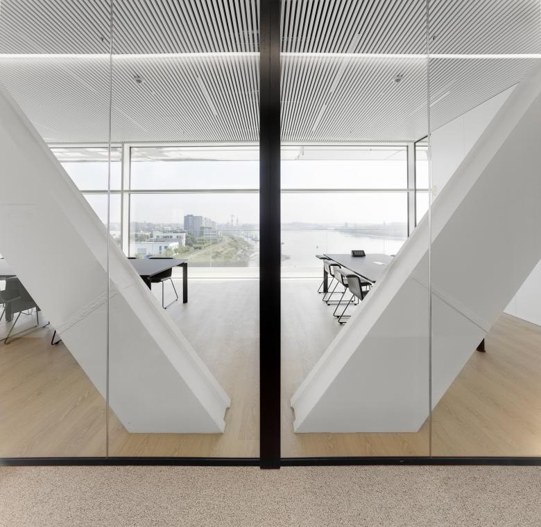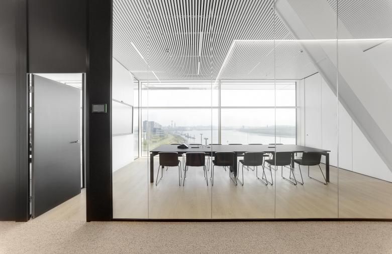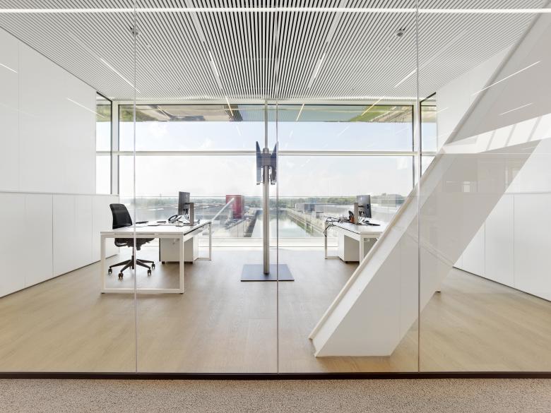 The 2 office floors, 2,300 m² each, are fully glazed from floor to ceiling and are surrounded by terraces. The structural grid of 3.60 m allows for a flexible layout of the office space, resulting in a mix of landscape offices, meeting rooms and offices for project managers and management. The multipurpose rooms with a spacious adjoining terrace at the southern end of the building offer a fantastic panoramic view of the surroundings.
