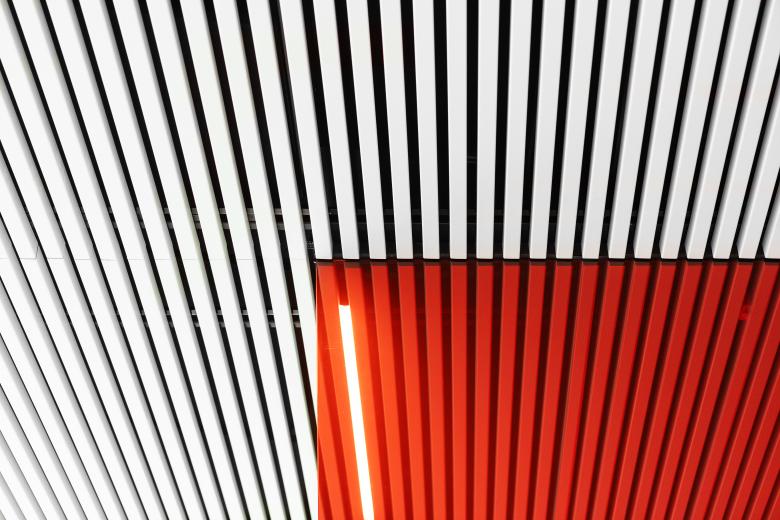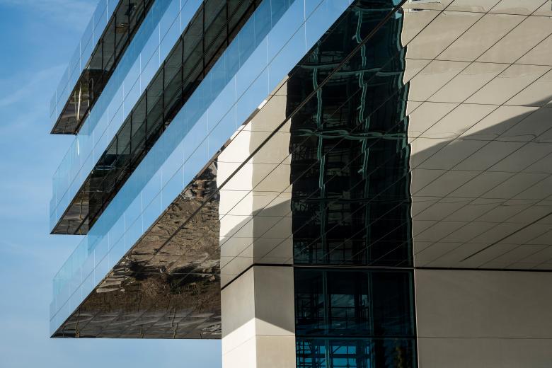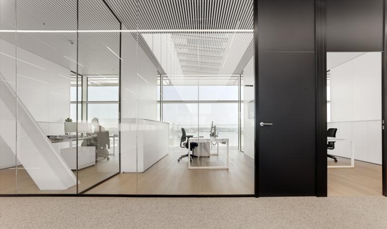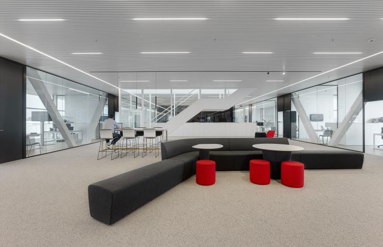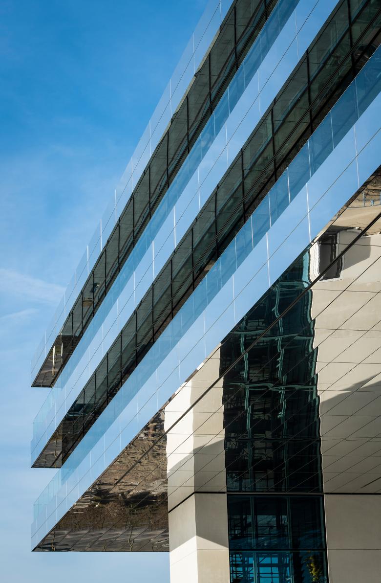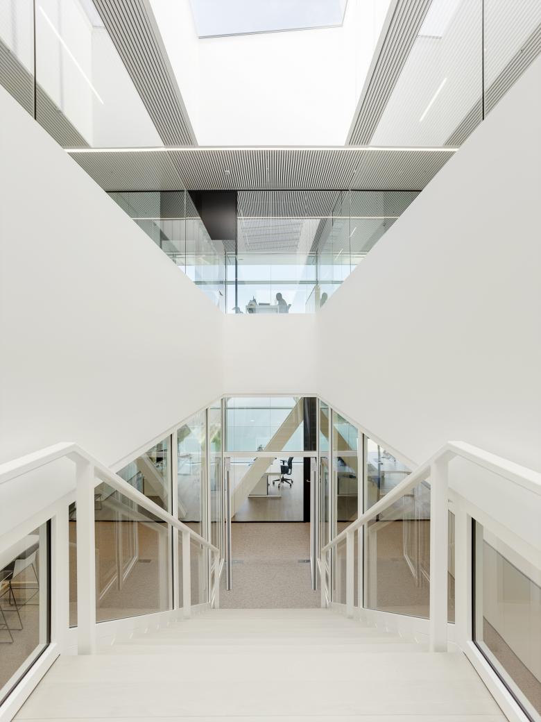 The 2 office floors, 2,300 m² each, are fully glazed from floor to ceiling and are surrounded by terraces. The structural grid of 3.60 m allows for a flexible layout of the office space, resulting in a mix of landscape offices, meeting rooms and offices for project managers and management. The multipurpose rooms with a spacious adjoining terrace at the southern end of the building offer a fantastic panoramic view of the surroundings.