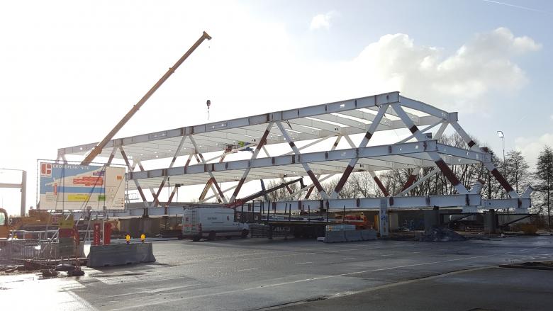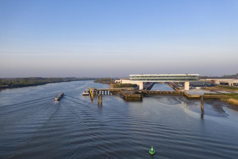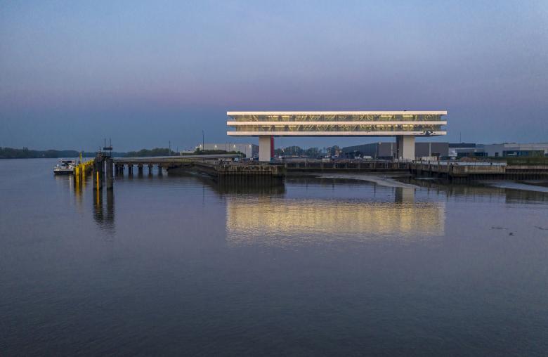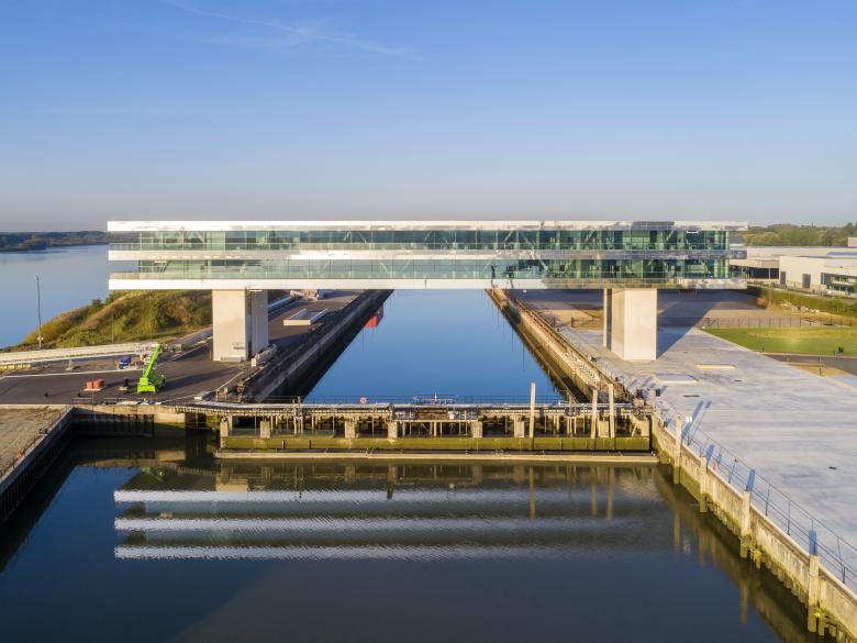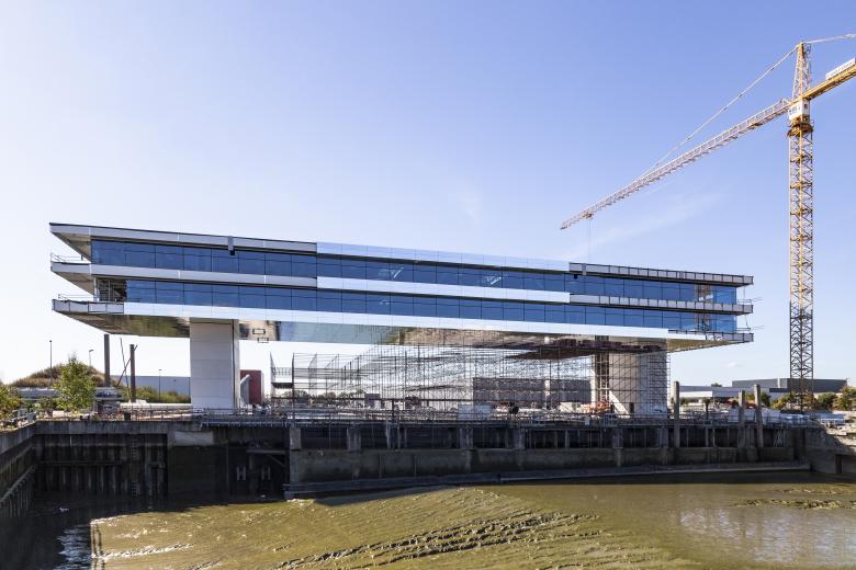 The existing dry dock is spanned in width by a steel structure of two double-high trusses with intermediate sleepers. It will be installed on two concrete building volumes that are 73 m apart, and that also contain the entrances to the office, each with two elevators and two staircases.